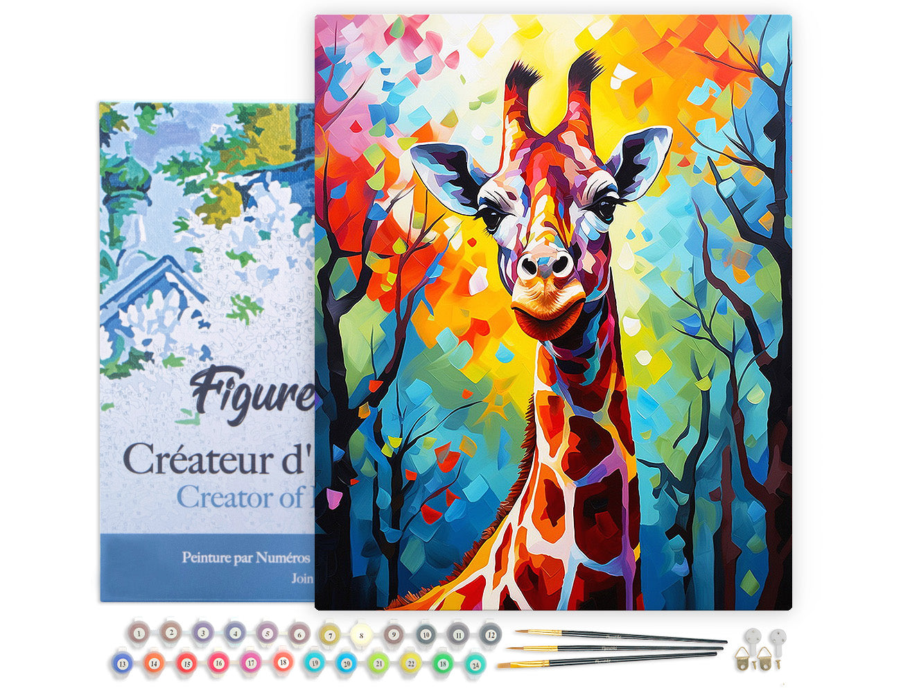 Jedes Set von Figured’Art enthält alles, was Sie brauchen: eine vorgedruckte, nummerierte Leinwand, vorgemischte Acrylfarben, ein Pinselset und je nach Variante einen Keilrahmen oder eine gerollte Leinwand. Durch das Ausfüllen der nummerierten Felder mit der passenden Farbe entsteht Schritt für Schritt eine eindrucksvolle Giraffe in lebendigen, abstrakten Tönen.