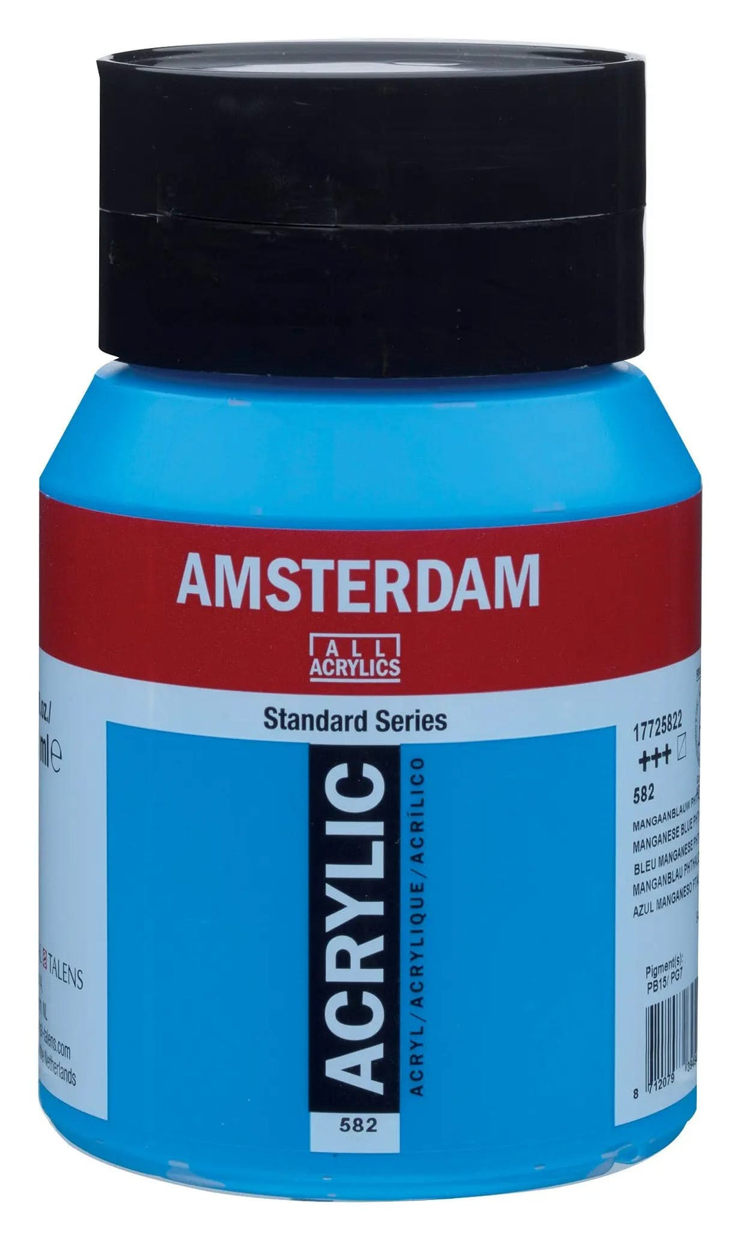 Entdecken Sie die Amsterdam Standard Series Acrylfarbe in der praktischen 500 ml Flasche – Farbe: Manganblau Phthalo (582). Diese hochwertige Acrylfarbe besticht durch ihre halbdeckende Konsistenz und eine exzellente Lichtechtheit (+++), die Ihre Kunstwerke langfristig strahlen lässt.
