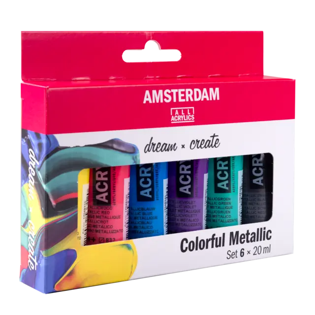 Verleihen Sie Ihren Kunstwerken mit dem Amsterdam Standard Serie Acryl farbenfrohes Metallicset einen einzigartigen, glänzenden Effekt. Dieses Set enthält 6 Tuben à 20 ml hochwertiger Metallic-Acrylfarben, die durch ihre brillante Farbintensität und den faszinierenden Schimmer überzeugen.