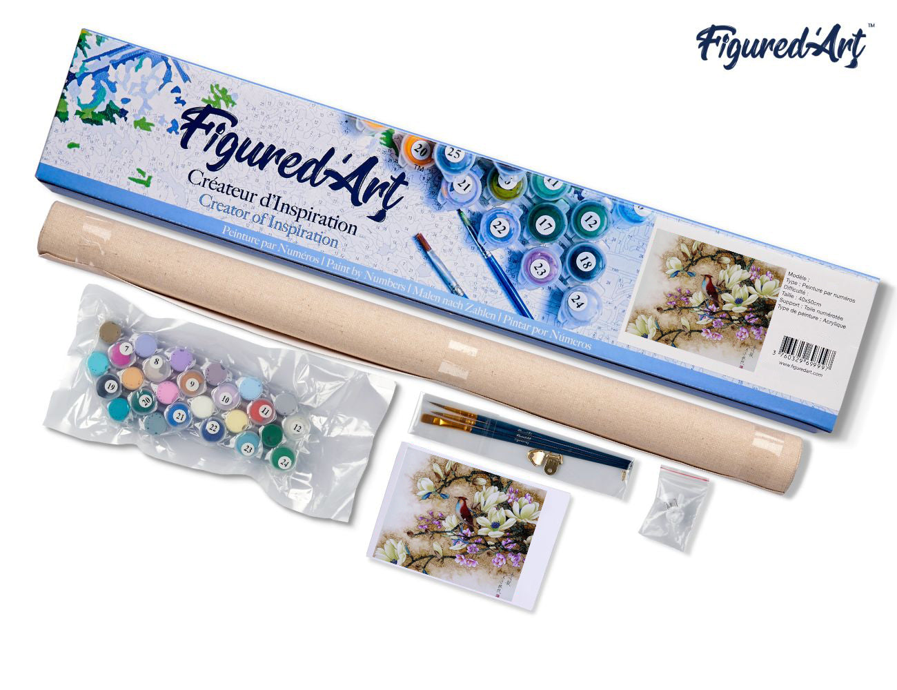 Entdecken Sie das Malen nach Zahlen Set Magnolien in Blüten von Figured’Art – 40×50 cm, gerollte Leinwand ohne Keilrahmen. Dieses Set verbindet kreative Entspannung mit hochwertiger Ausstattung, damit Sie direkt Ihr eigenes Kunstwerk gestalten können.