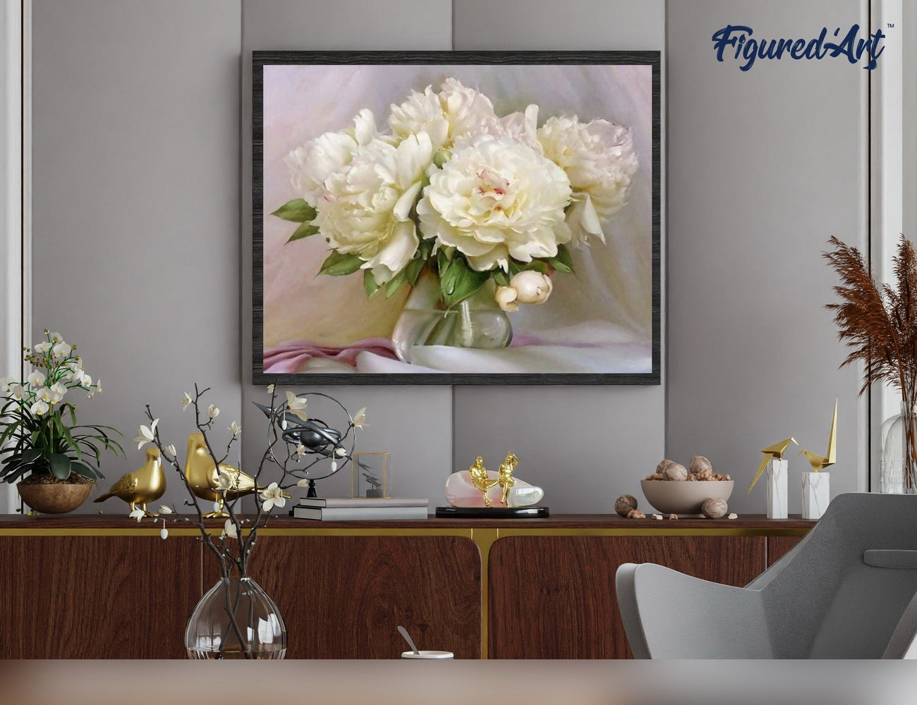 Entdecken Sie das Malen nach Zahlen-Set von Figured’Art: ein 40x50 cm großes, gerolltes Leinwand-Set ohne Keilrahmen mit dem zarten Motiv Weisse Pfingstrosen. Dieses Komplett-Set liefert alles, was Sie brauchen, um sofort Ihr eigenes Kunstwerk zu schaffen – nummerierte Leinwand, Farbset, Pinsel in verschiedenen Größen und Montagematerial.