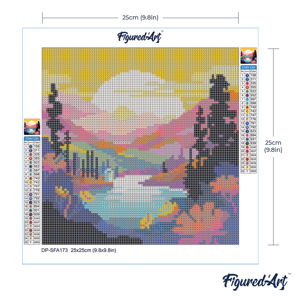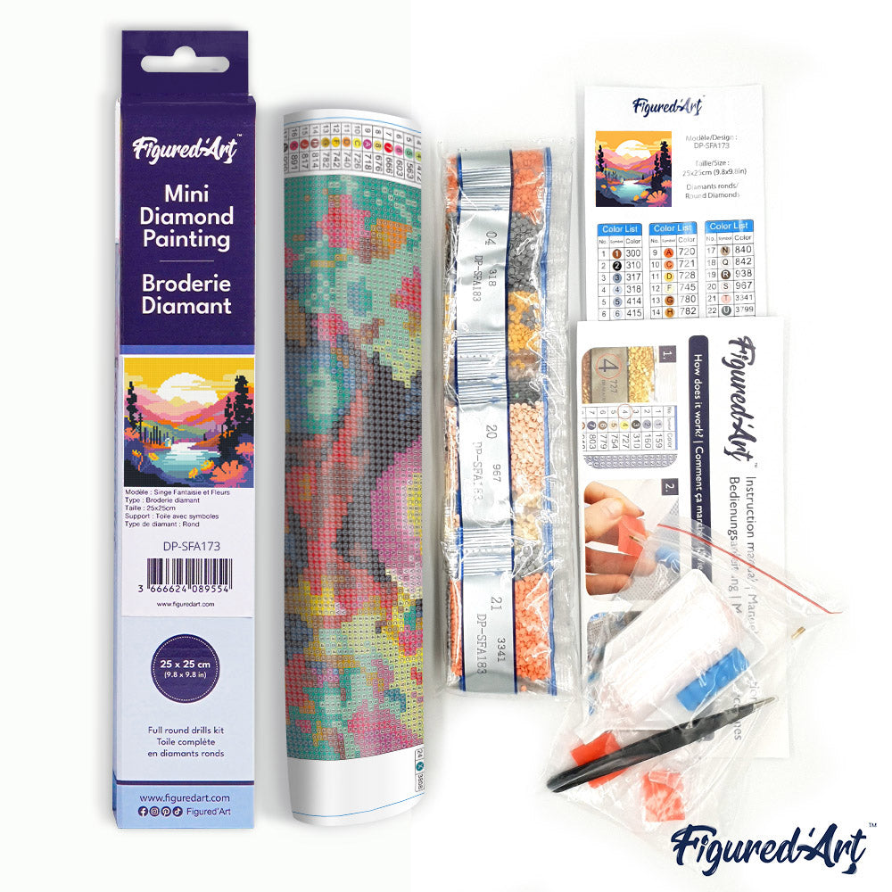 Figured'Art präsentiert das Mini Diamond Painting Set – Bunter Sonnenuntergang am See, 25 x 25 cm, ohne Keilrahmen. Dieses Set vereint alles, was Sie brauchen, um ein strahlendes, funkelndes Kunstwerk zu schaffen: eine selbstklebende, nummerierte Leinwand, farblich sortierte Diamanten, Werkzeugset und mehr. Ideal für Einsteiger und erfahrene Diamond-Painter gleichermaßen.