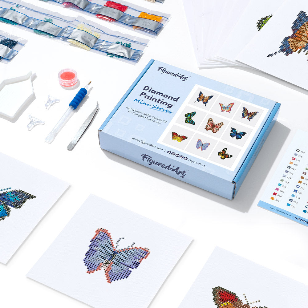 Mini-Serie Diamond Painting – Schmetterlinge von Figured'Art ist das kompakte DIY-Kunstset für alle Fähigkeitsstufen. Genießen Sie Entspannung und kreativen Spaß beim Diamant-Malen – perfekt für schnelle, hübsche Kunstwerke zuhause oder unterwegs.