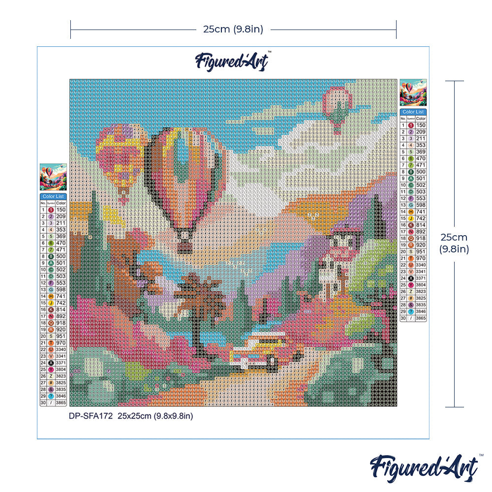 Mit dem Mini Diamond Painting Set Ballons über dem Tal von Figured'Art verwandeln Sie glitzernde Diamanten in ein bezauberndes Kunstwerk – kompakt, präzise und ideal als kleines DIY-Projekt. Die 25 x 25 cm große, gerollte Leinwand kommt ohne Keilrahmen und setzt das Motiv Ballons über dem Tal in funkelndem Glanz um.