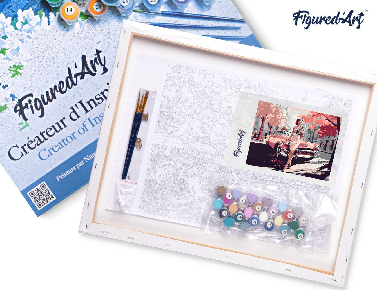 Malen nach Zahlen 40x50cm auf Keilrahmen gespannt Figured’Art Dame mit Rosa Oldtimer