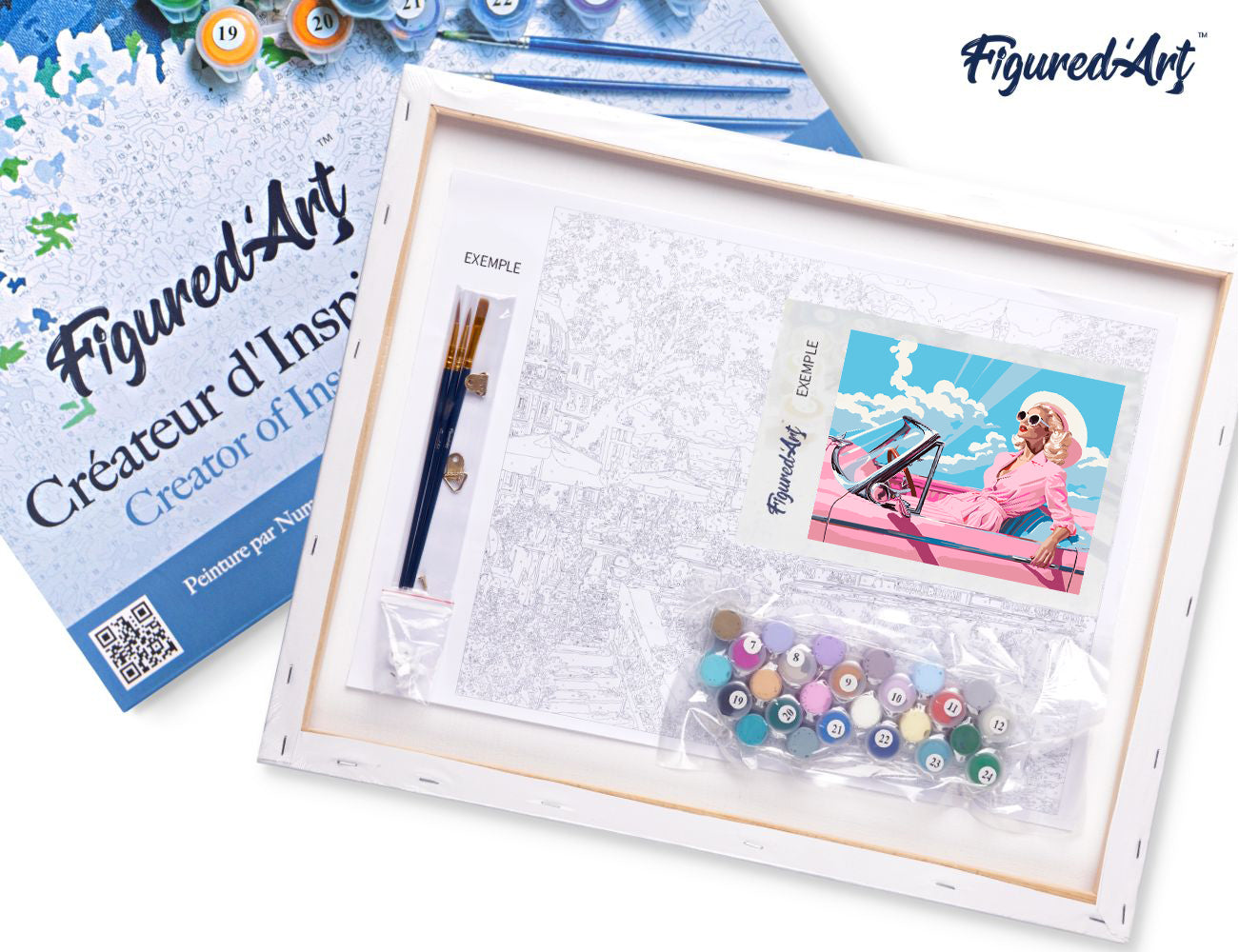 Malen nach Zahlen 40x50cm auf Keilrahmen gespannt Figured’Art Diva in einem rosa Retro-Auto