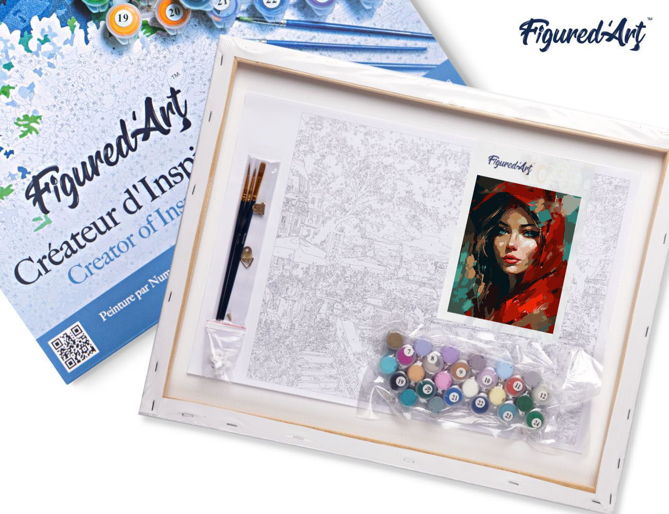Malen nach Zahlen 40x50cm auf Keilrahmen gespannt Figured’Art Frau im Roten Schal