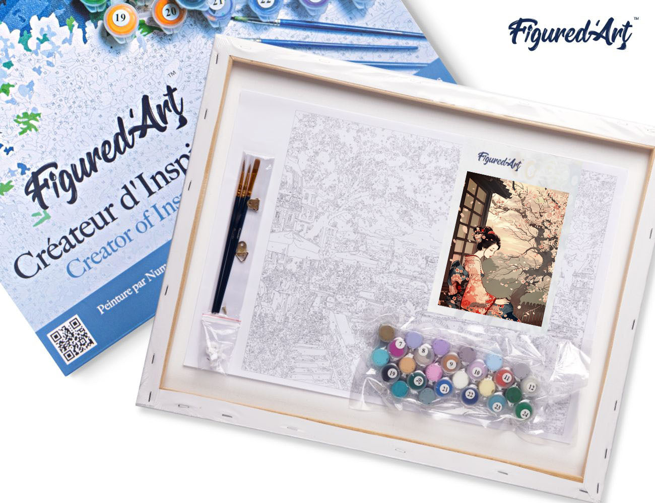 Malen nach Zahlen 40x50cm auf Keilrahmen gespannt Figured’Art Frau im Vintage-Kimono und Kirschblüten
