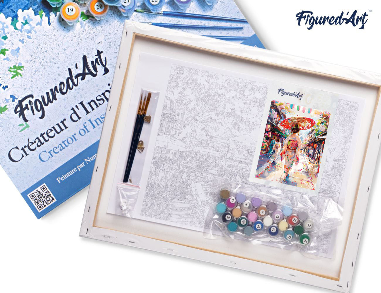 Malen nach Zahlen 40x50cm auf Keilrahmen gespannt Figured’Art Geisha in einer Vintage-Straße