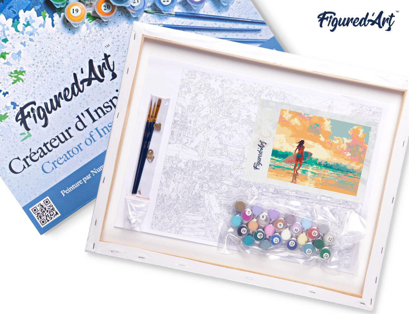Malen nach Zahlen 40x50cm auf Keilrahmen gespannt Figured’Art Surfmädchen im Morgengrauen