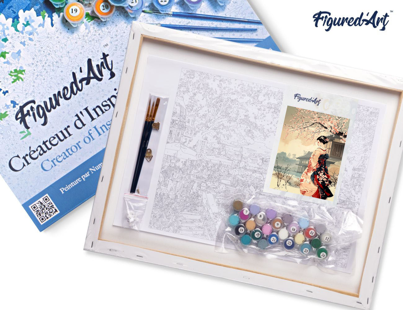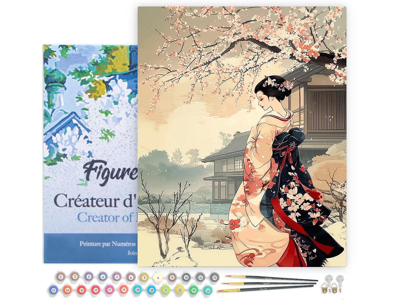 Malen nach Zahlen 40x50cm auf Keilrahmen gespannt Figured’Art Frau im Vintage-Kimono und Kirschblüten