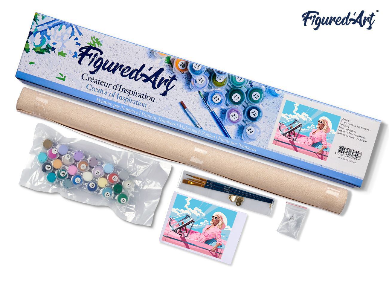 Malen nach Zahlen 40x50cm ohne Keilrahmen Figured’Art Diva in einem rosa Retro-Auto