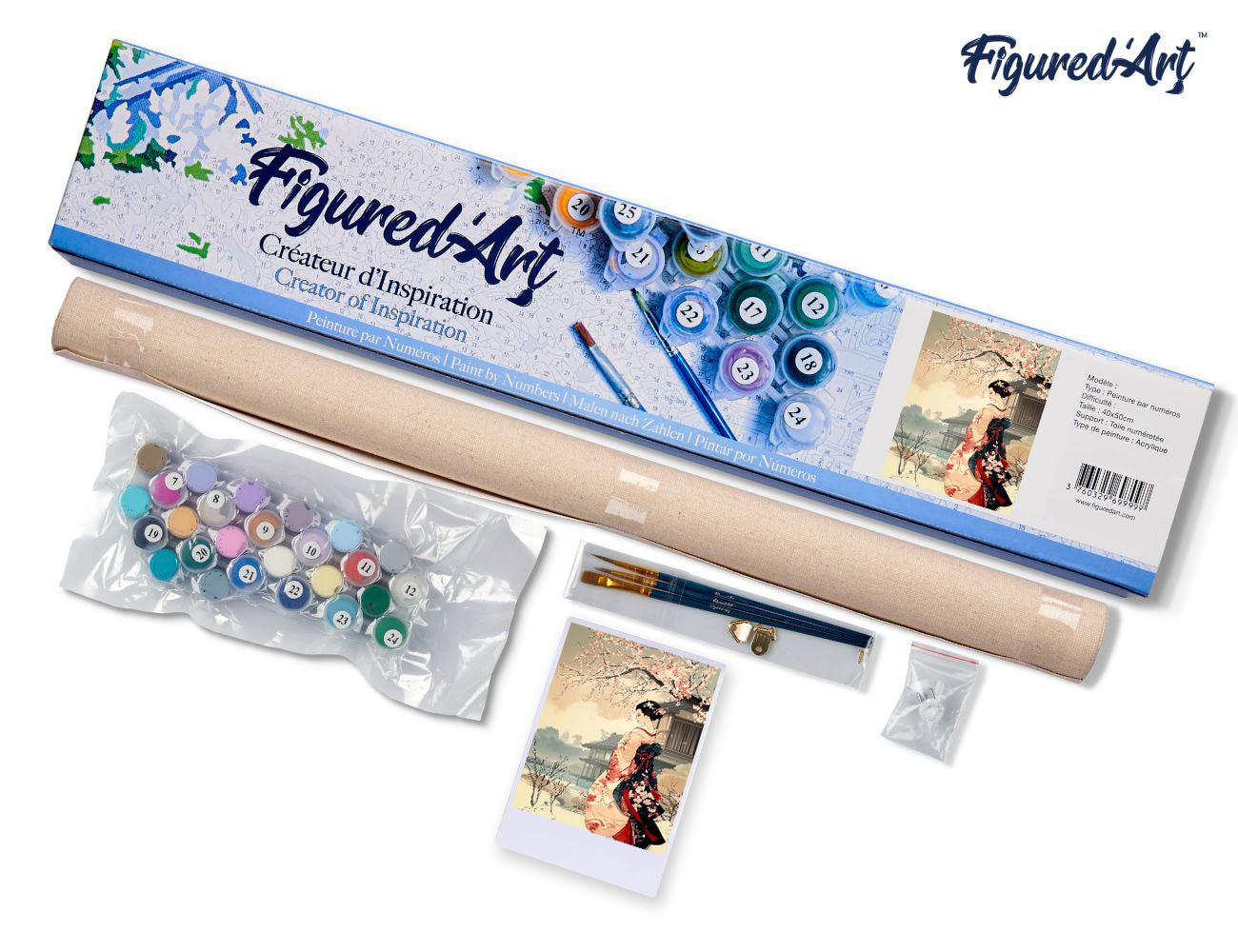 Malen nach Zahlen 40x50cm auf Keilrahmen gespannt Figured’Art Frau im Vintage-Kimono und Kirschblüten