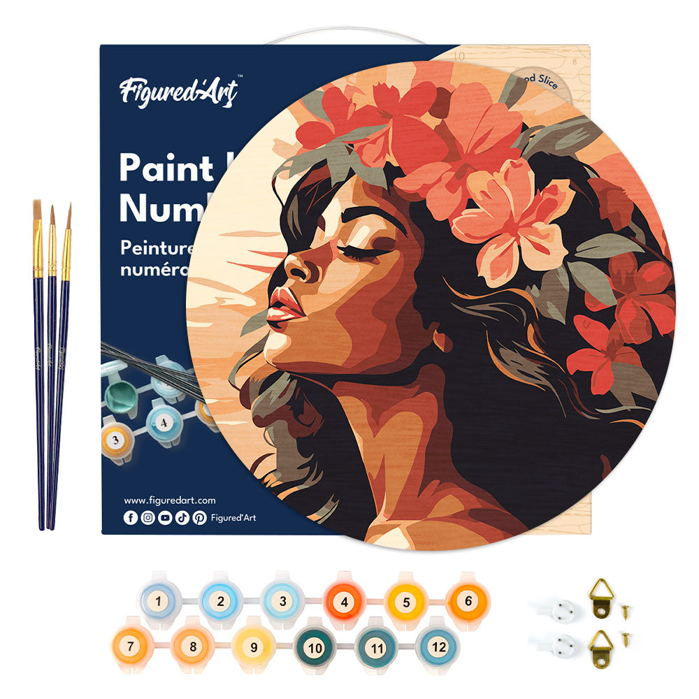 Entdecken Sie das Malen nach Zahlen auf Holzscheibe – Blumenfrau von Figured'Art, eine ruhige, kreative Oase für zuhause. Perfekt, um dem Alltag zu entfliehen, mit klarer Anleitung auch ohne Vorerfahrung beeindruckende Ergebnisse zu erzielen und Ihre Einrichtung mit persönlicher Kunst zu bereichern.