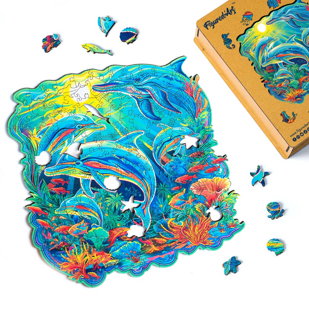 Holzpuzzle 2D Design – Delfine und Korallenriff vereint künstlerische Details mit entspannendem Spiel. Unsere originellen Designs und die vielfältig geformten Teile verwandeln jedes Lösen in eine kleine Meer-Reise. Dieses Premium-Puzzle verspricht Stunden der Ruhe und eine elegante Note dank der gravierten Aufbewahrungsbox. Ideal als anspruchsvolles Geschenk für Genießer von Holzpuzzle-Kunst und entspannter Freizeitgestaltung.