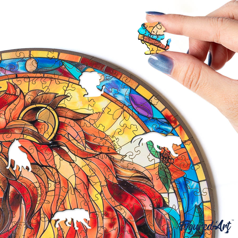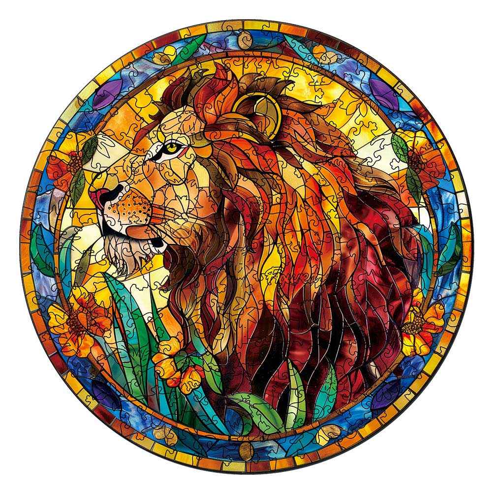 • 2D-Holzpuzzle – Löwe im Stil eines Buntglasfensters.