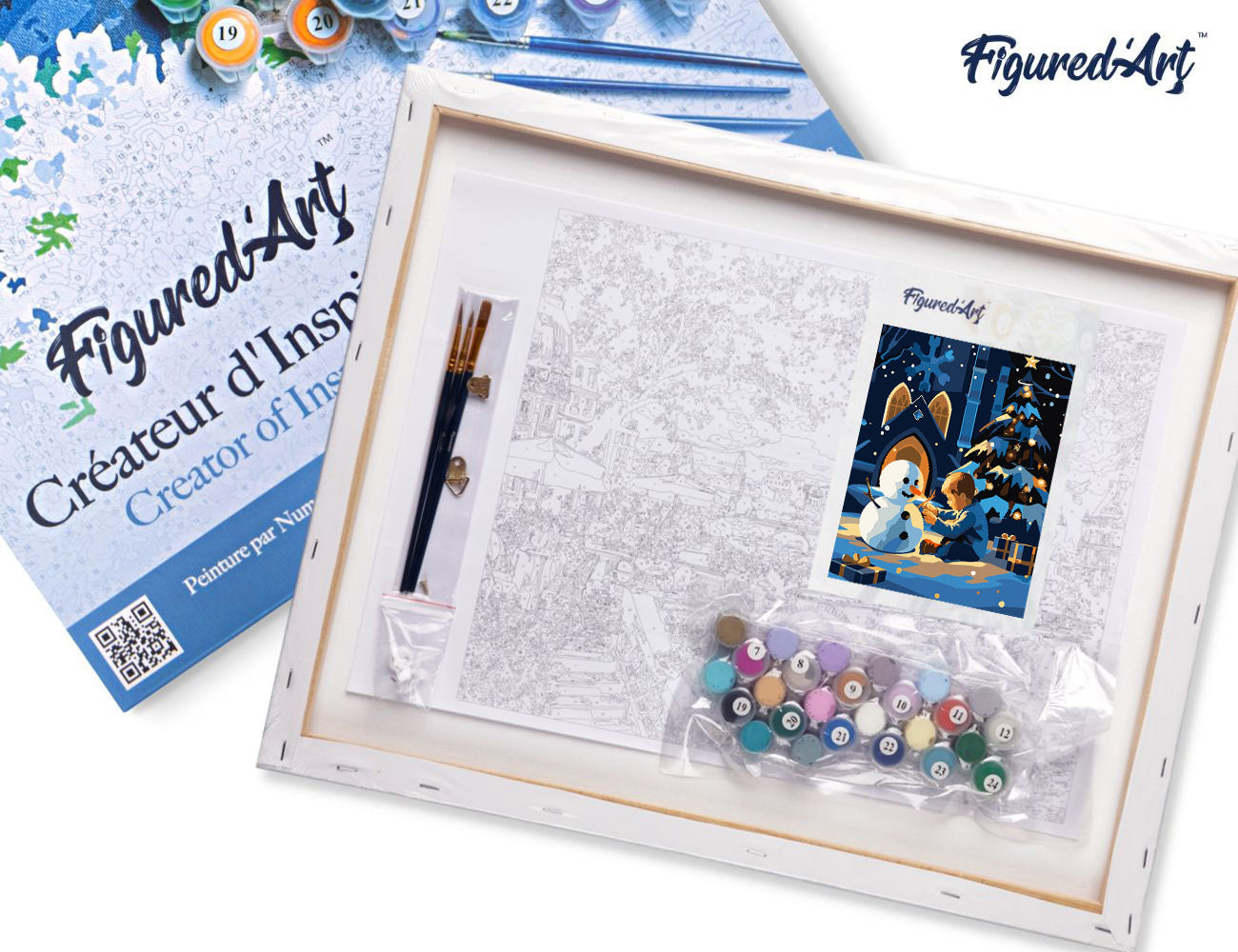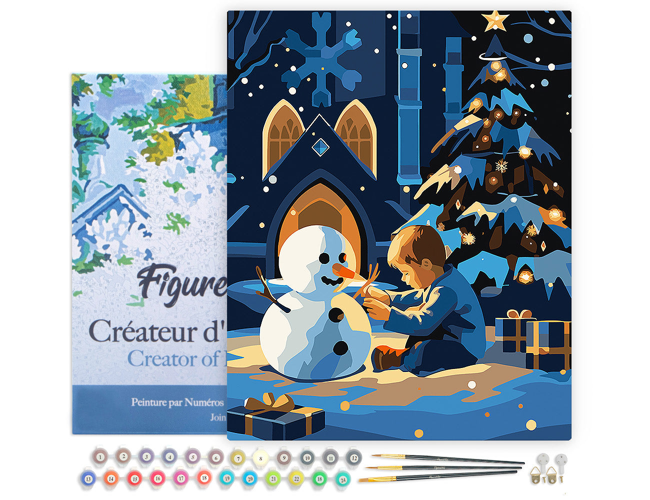 Malen nach Zahlen 40x50cm auf Keilrahmen gespannt Figured’Art Junge und Schneemann in einer Winternacht