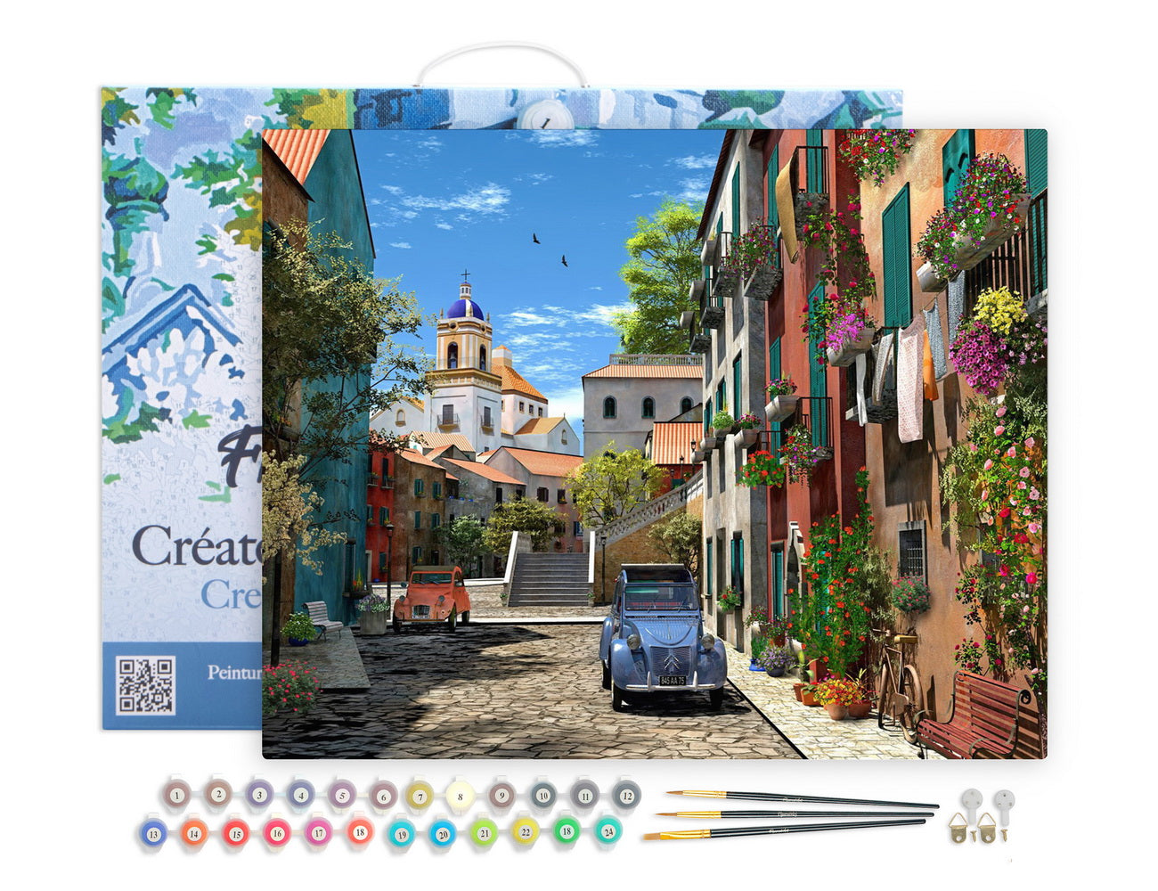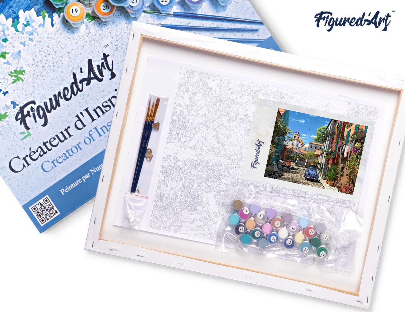 Entdecken Sie Figured'Art Malen nach Zahlen: ein 40x50 cm großes Kunstwerk auf Keilrahmen gespannt, dargestellt als charmante Gasse mit einem ikonischen 2CV. Das hochwertig verarbeitete Komplett-Set eignet sich perfekt für Einsteiger ebenso wie für erfahrene Hobbykünstler und bietet kreative Entspannung mit stilvollem Malspaß.