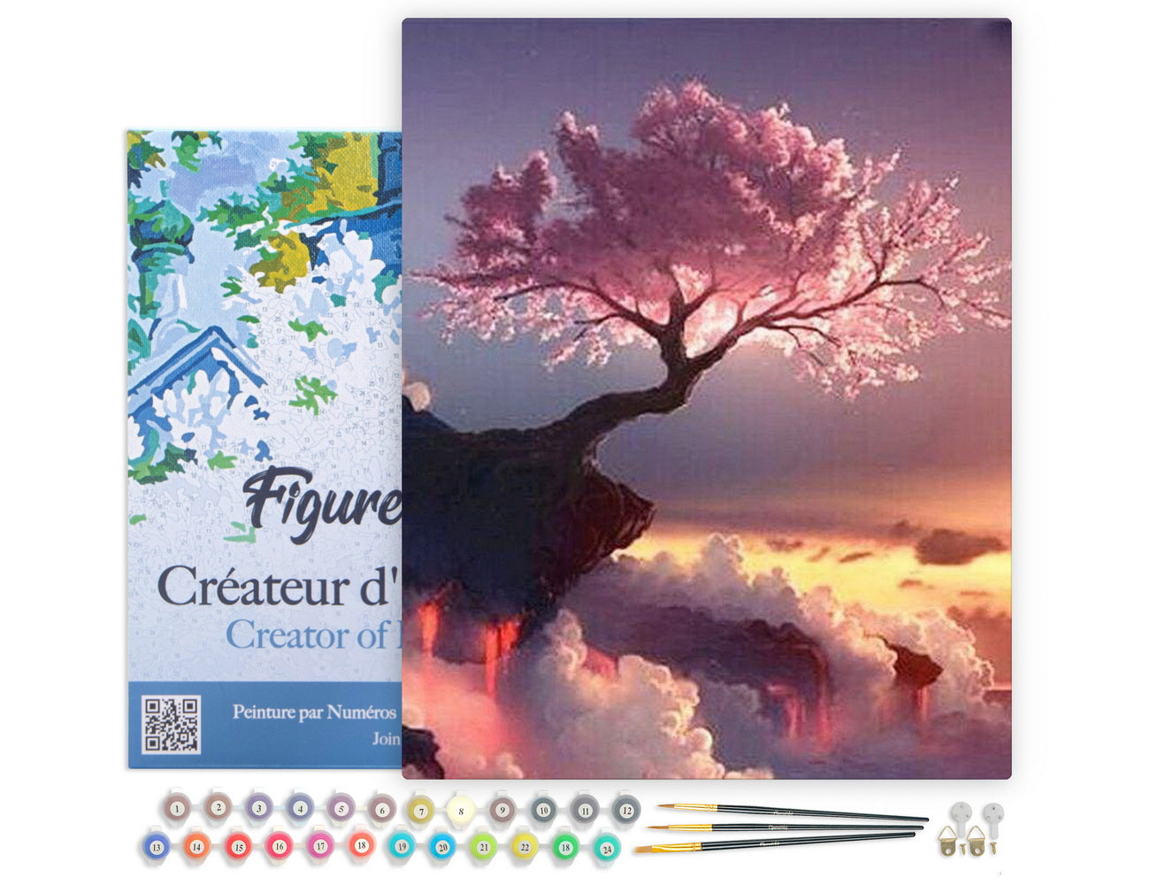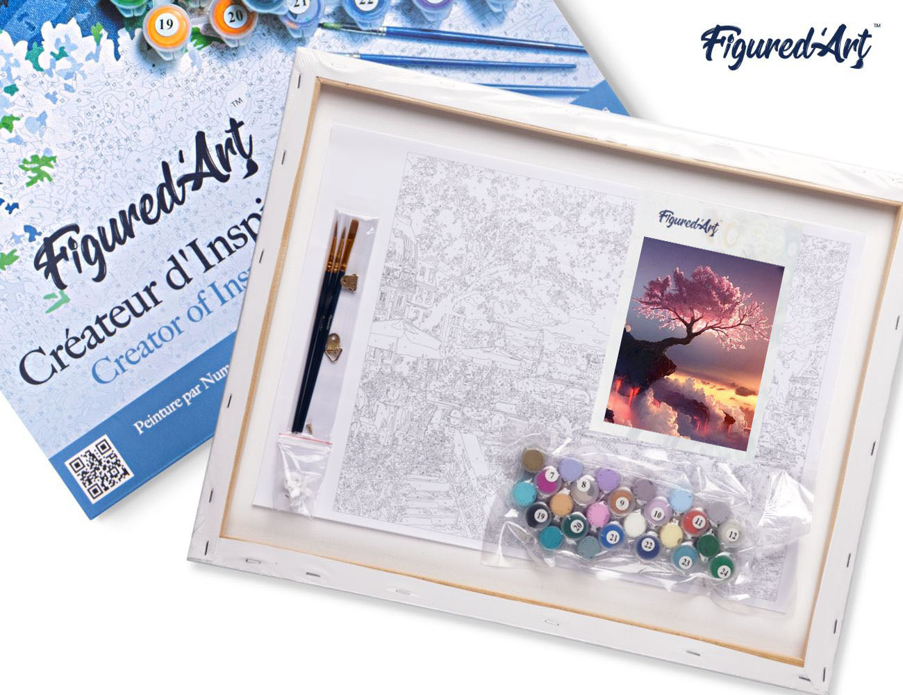 Figured'Art Malen nach Zahlen – Komplett-Set auf Keilrahmen, 40x50 cm, Rosaroter Baum & Wolken. Dieses hochwertige Set richtet sich an Einsteiger genauso wie an erfahrene Hobbykünstler und macht kreativen Relax-Genuss greifbar.