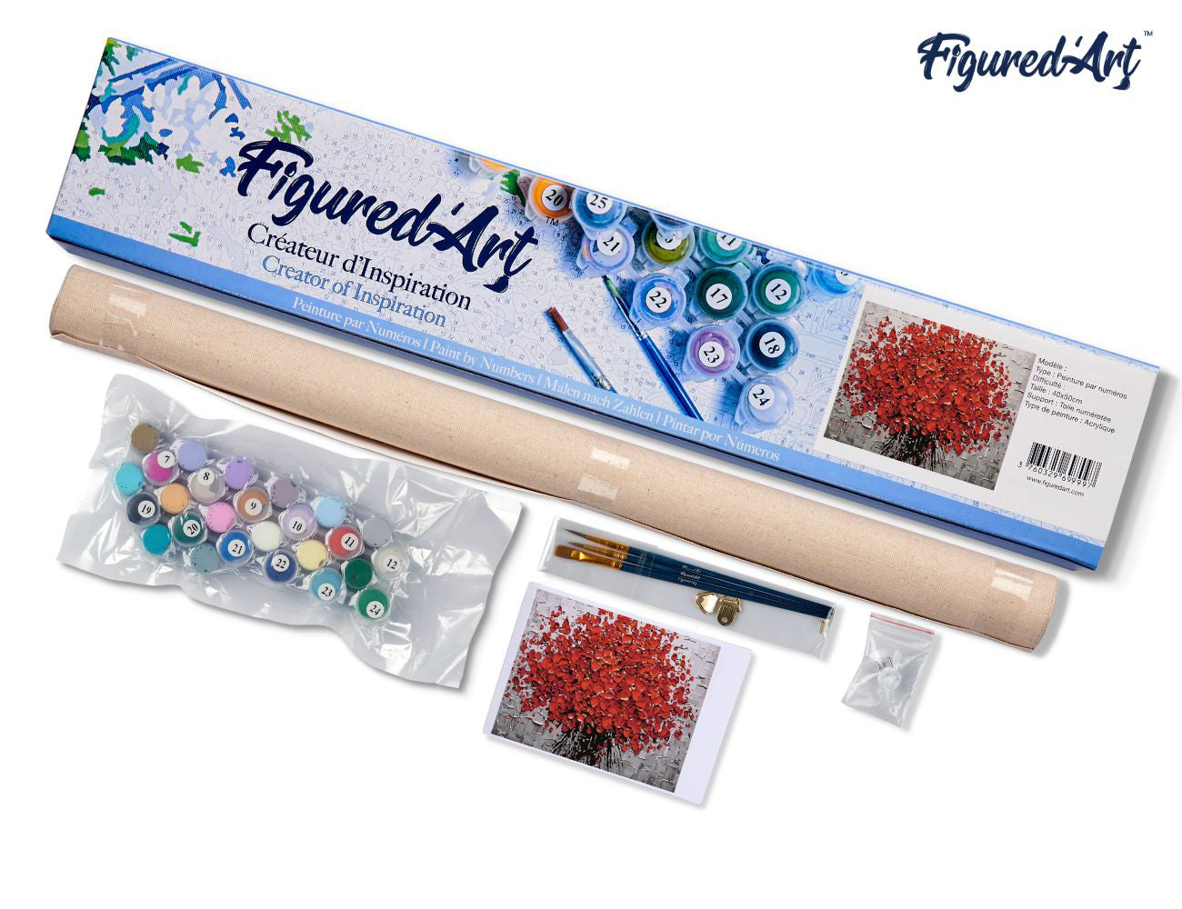 Figured’Art präsentiert Malen nach Zahlen in 40 × 50 cm ohne Keilrahmen: eine kraftvolle Abstraktion roter Blumen, die Modernität mit entspannter Kreativität verbindet. Dieses Komplettset enthält alles, was Sie brauchen, um sofort loszulegen und Ihr fertiges Kunstwerk schon bald an der Wand zu bewundern.