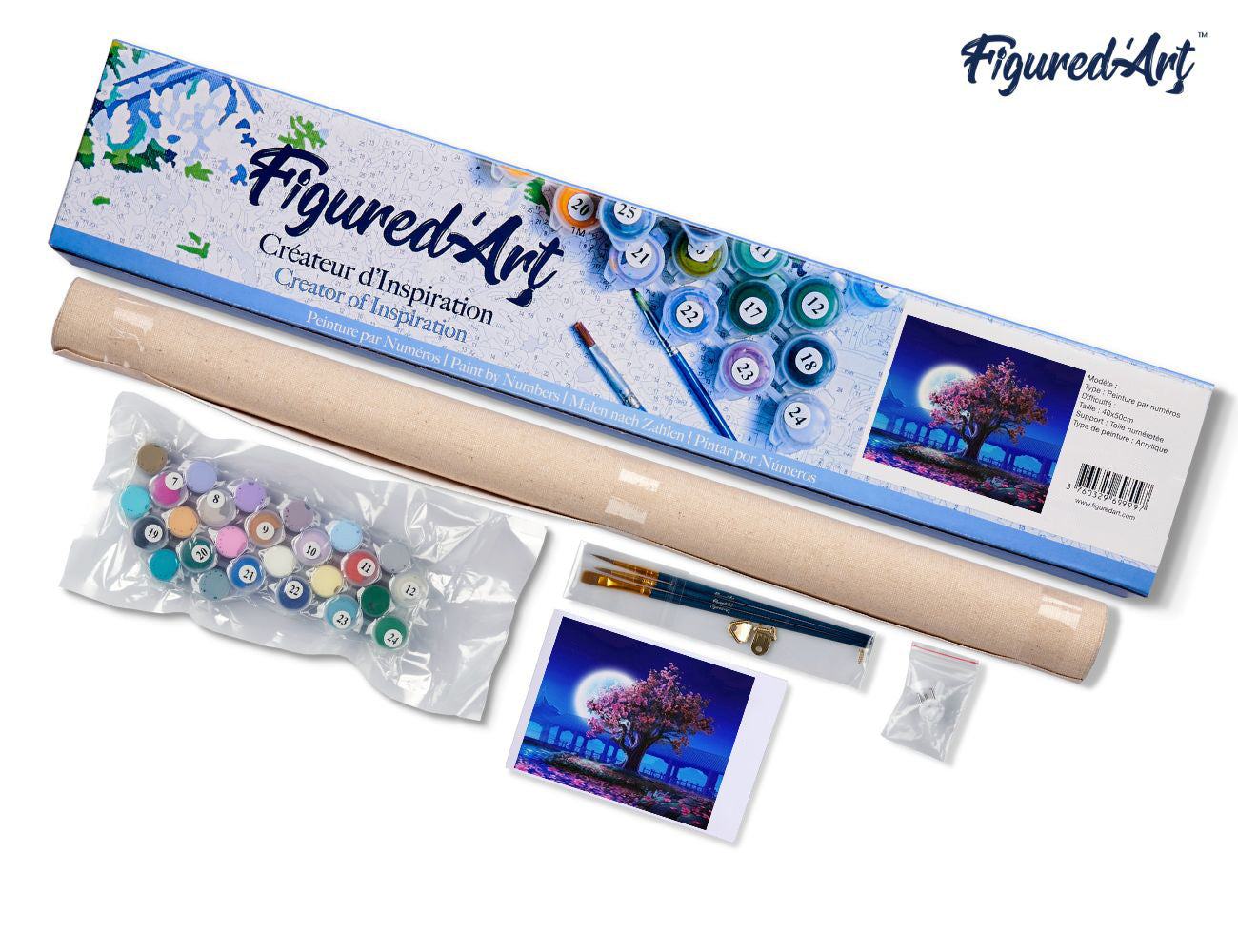 Entdecken Sie das Malen nach Zahlen-Set von Figured'Art – Baum und grosser Mond in einer beruhigenden Landschaft. Das 40x50 cm große Motiv kommt gerollt ohne Keilrahmen und liefert alles, was Sie für sofortiges Malvergnügen benötigen: eine nummerierte Leinwand, hochwertiges Pinselset aus Nylon, ein nummeriertes Farbset, eine Motivvorlage sowie Schrauben und Haken für die Wandbefestigung.