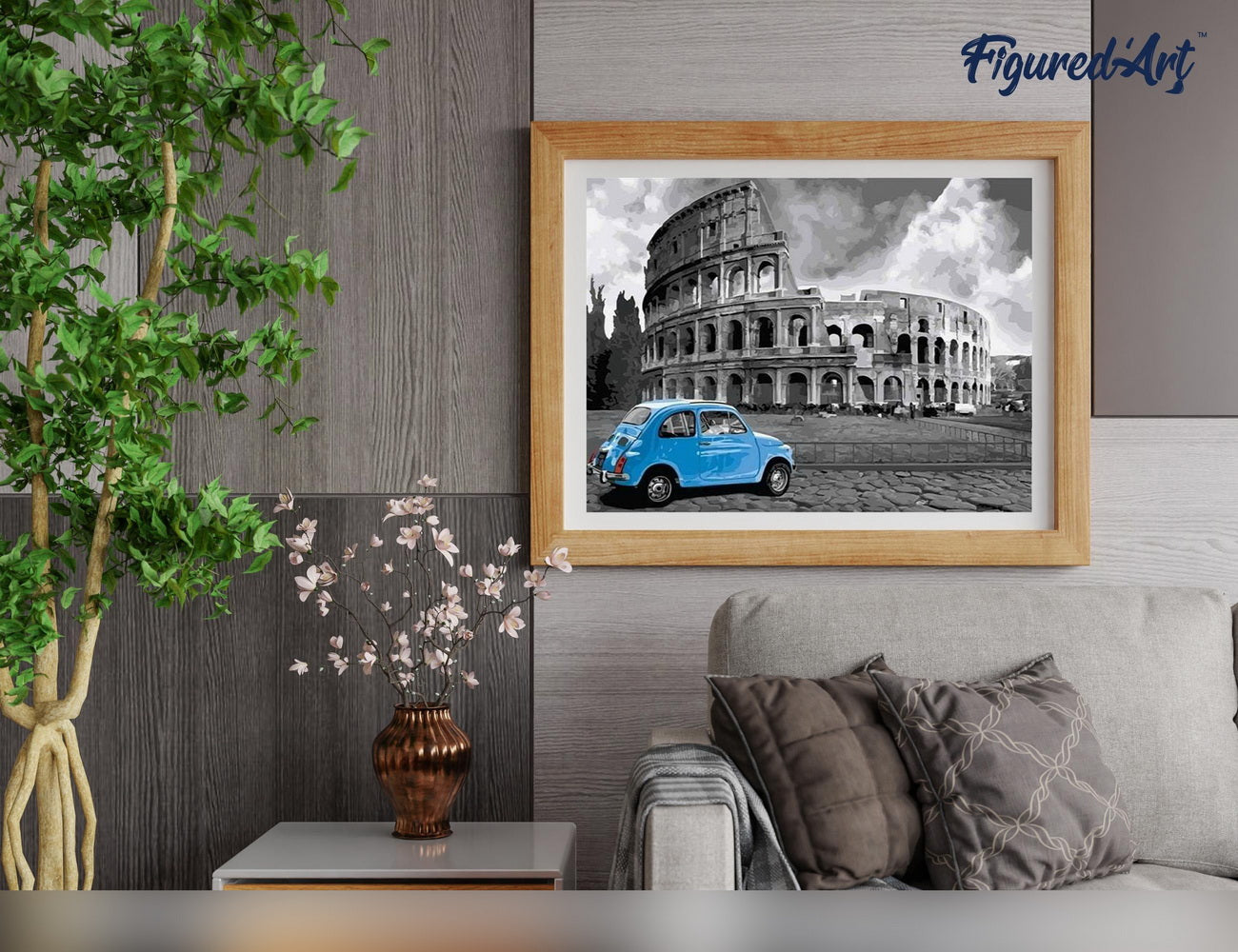 Entdecken Sie das Malen nach Zahlen-Set von Figured’Art: Blaues Auto am Koloseum, auf einer 40x50 cm großen Leinwand, bereit zum Gestalten. Die Leinwand ist gerollt und ohne Keilrahmen – flexibel zum Aufhängen und ideal für schnelle Ergebnisse.
