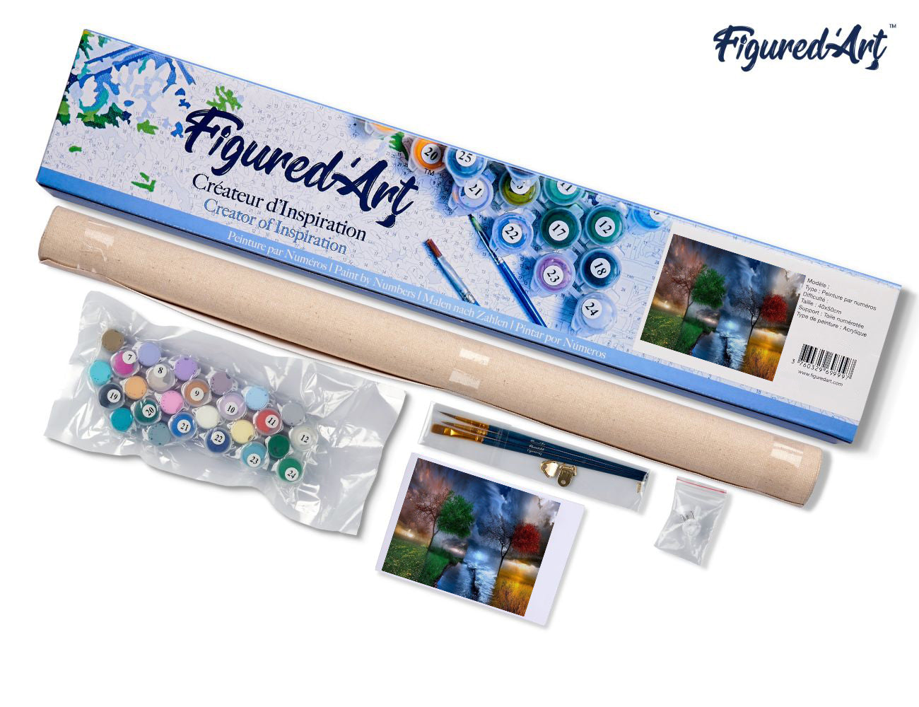 Erleben Sie kreative Entspannung mit dem Malen nach Zahlen Set von Figured’Art. Das 40x50 cm große Paket kommt gerollt ohne Keilrahmen und liefert alles, was Sie brauchen, um Ihr eigenes Kunstwerk der vier Jahreszeiten zu schaffen – eine nummerierte Leinwand, Pinsel, Farbset, Motivvorlage und Montagematerial inklusive.