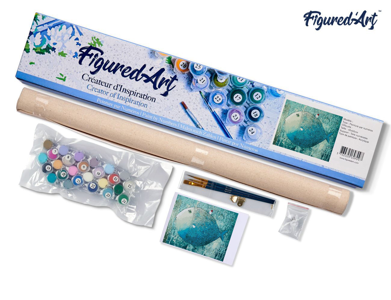 Entdecken Sie das Malen-nach-Zahlen Set von Figured’Art: Künstlerischer Fisch – ein kompaktes, inspirierendes Kunstprojekt für zu Hause. Die 40x50 cm gerollte Leinwand kommt ohne Keilrahmen, enthält alles Nötige für sofortigen Malspaß – inklusive Pinsel, Farbset und Motivpapierausdruck – und verwandelt Farbfelder in ein detailreiches Meisterwerk.