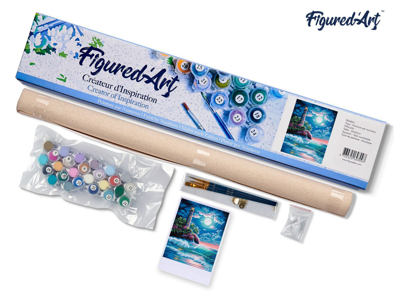 Entdecken Sie mit dem Figured’Art Malen nach Zahlen-Set Leuchtturm unter dem Vollmond eine entspannte Reise in die Kunst. Die 40×50 cm große, ungerahmte Leinwand macht das Malen einfach und befriedigend, während hochwertige Materialien und klare Farbcodes Schritt für Schritt zu einem eindrucksvollen Bild führen. Tauchen Sie ein in eine stimmungsvolle Szenerie aus mondlichtglitzerndem Meer und einem markanten Leuchtturm – perfekt für Anfänger und Fortgeschrittene gleichermaßen.