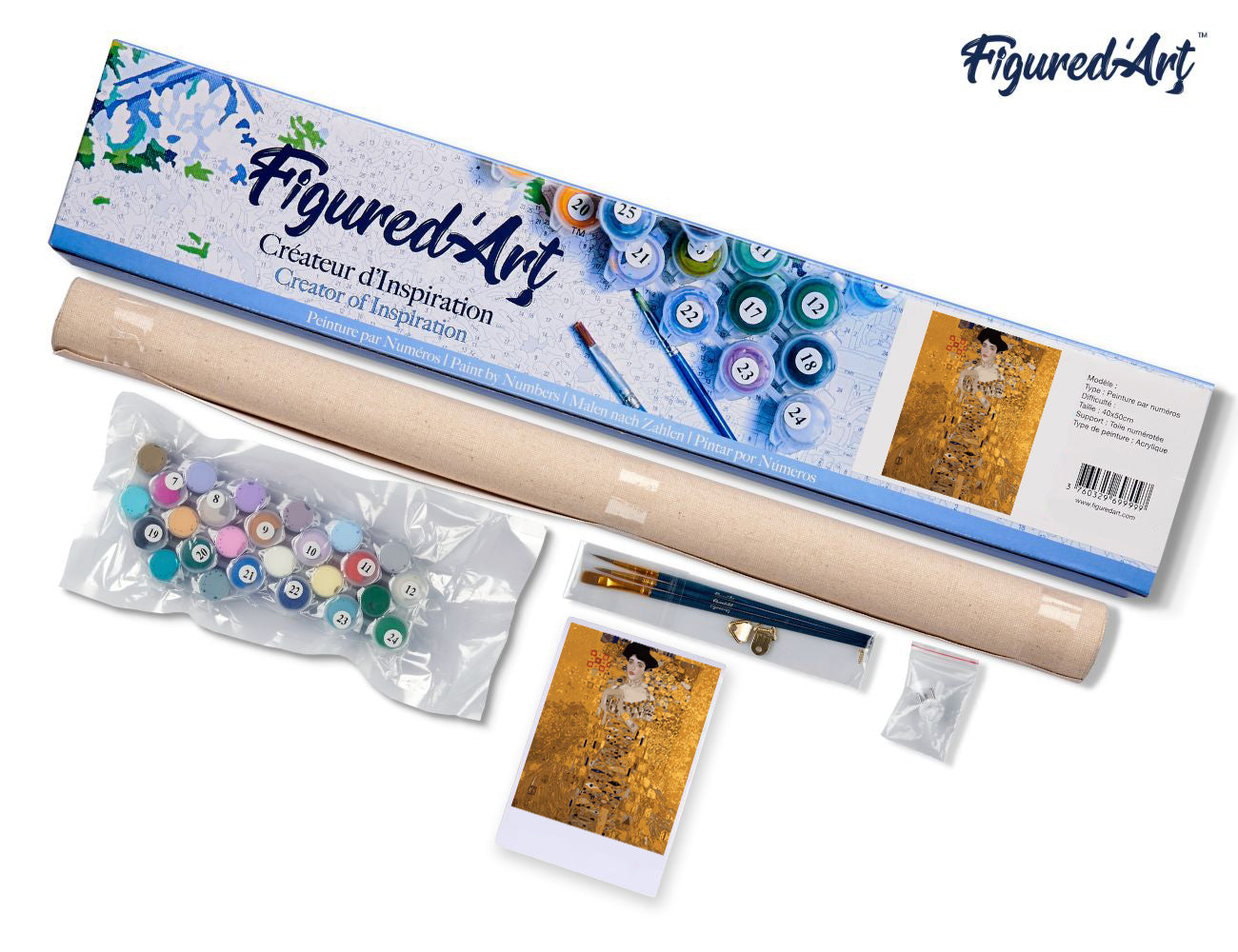 Malen nach Zahlen Adele Bloch-Bauer I – 40x50 cm von Figured’Art ist eine elegante Möglichkeit, das berühmte Portrait in eigener Hand neu zu interpretieren. Dieses Set kommt ohne Keilrahmen und bietet alles, was Sie brauchen, um direkt loszulegen: eine nummerierte Leinwand, farbig sortiertes Farbset, flexible Pinsel und eine klare Motivvorlage – perfekt für Einsteiger und erfahrene Künstler gleichermaßen.