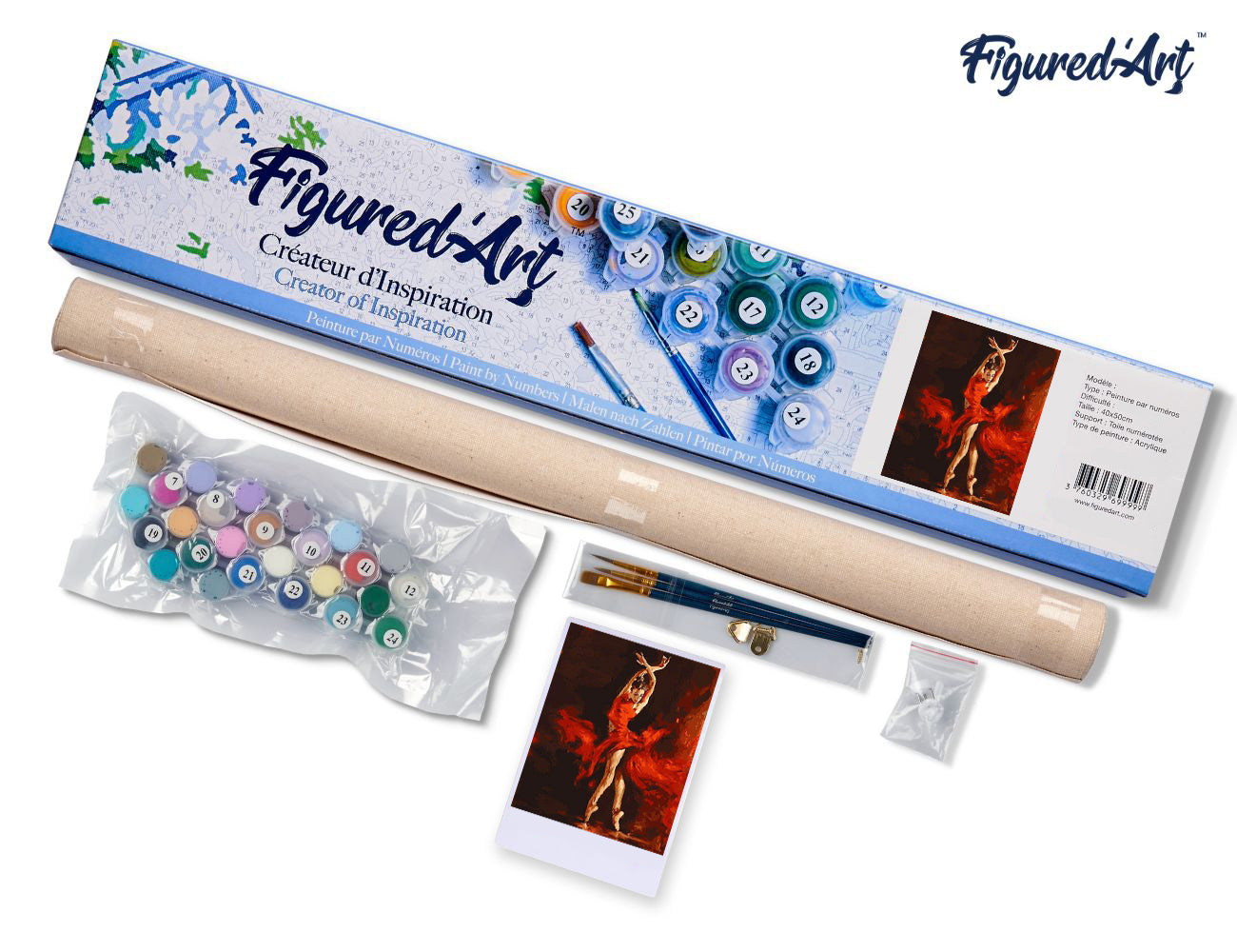 Figured’Art steht für hochwertige Malen-nach-Zahlen-Sets, die einfache Handhabung mit hervorragender Farbwiedergabe kombinieren. Das Rote Tänzerin-Motiv fordert und belohnt mit einem beeindruckenden Kunstwerk, das sich nach dem Malen sofort präsentieren lässt.
