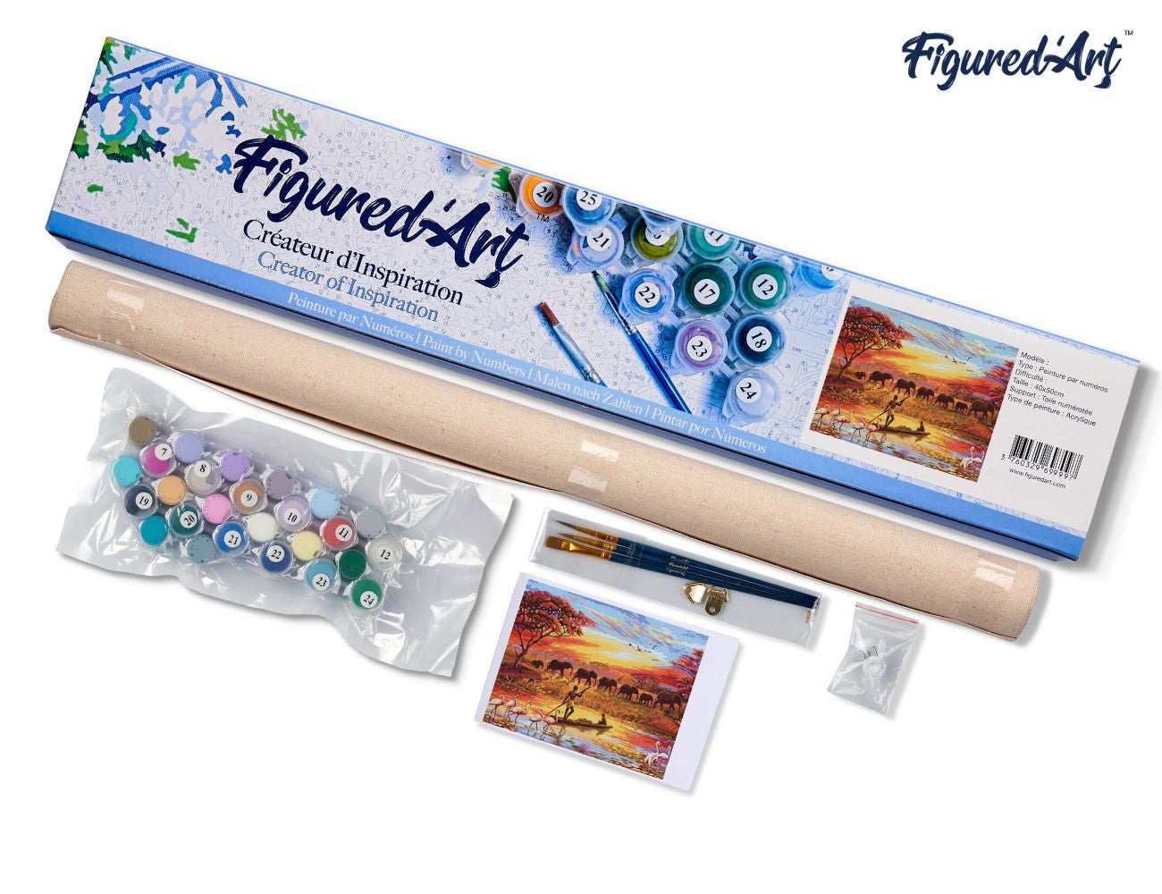 Warum dieses Set von Figured’Art wählen? Es bietet eine unkomplizierte Malerfahrung ohne Kompromisse bei der Qualität. Der beruhigende Sonnenuntergang mit Elefanten-Motiv sorgt für entspannte Stunden, während das vollständige Zubehörpaket eine schnelle Montage ermöglicht. Und dank der kompakten Verpackung gelingt das Kunstprojekt selbst auf kleinem Raum.