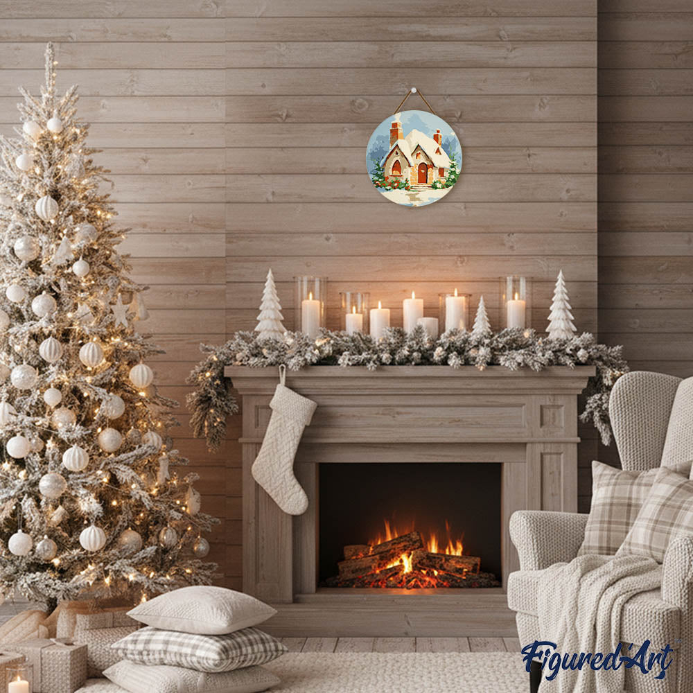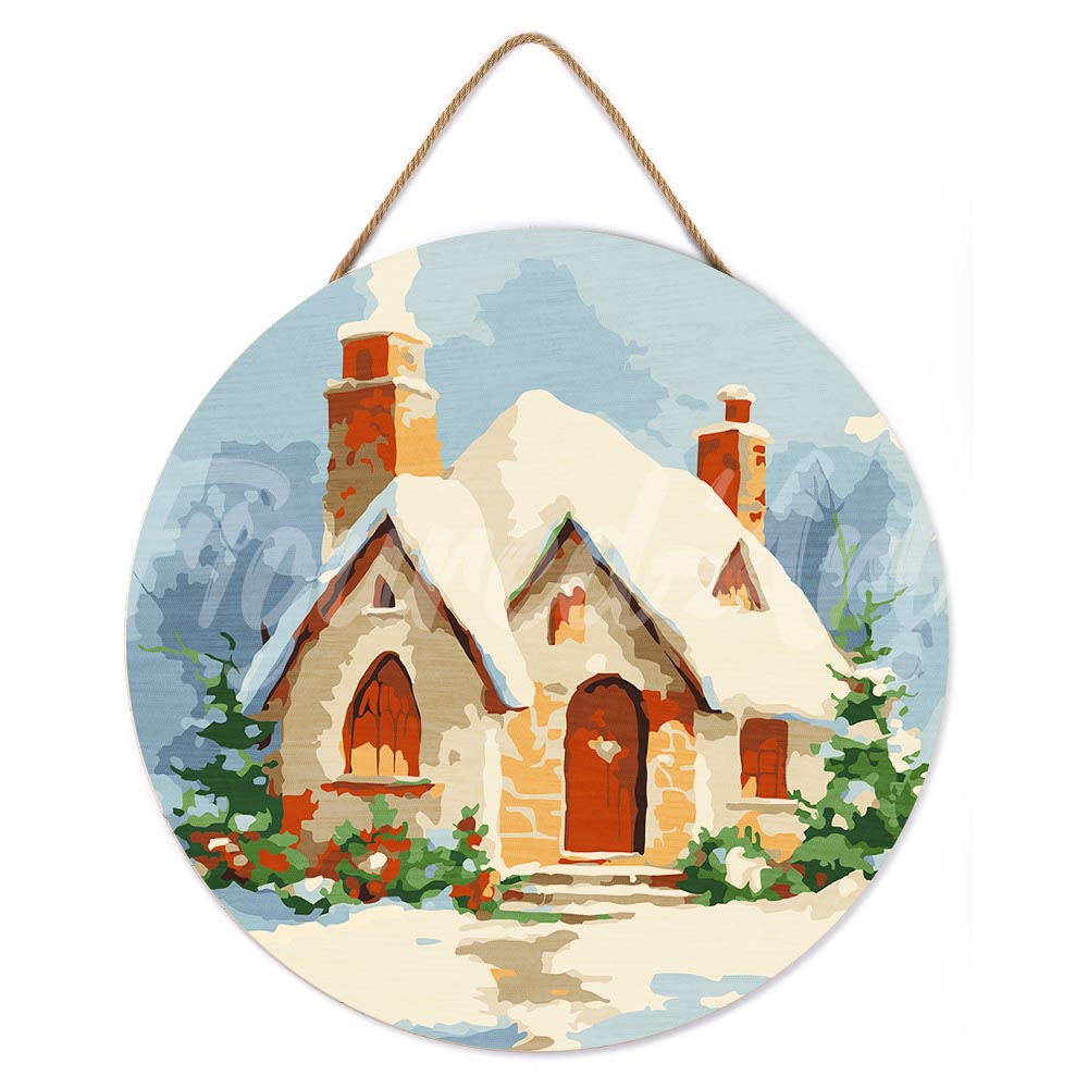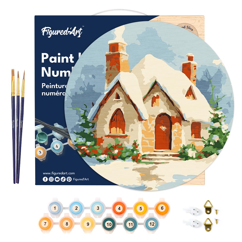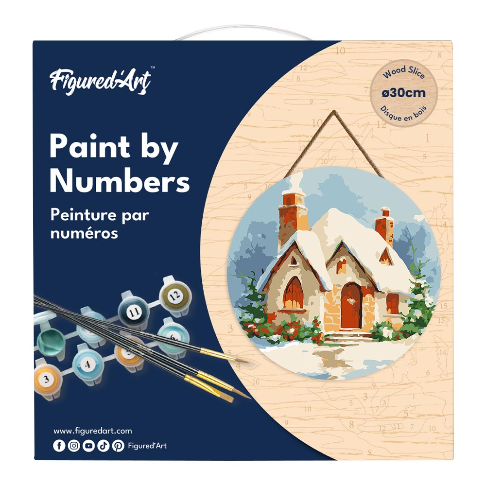 Bestellen Sie jetzt das Malen nach Zahlen auf Holzscheibe – Backsteinhaus im Schnee von Figured'Art und starten Sie sofort in Ihr persönliches DIY-Kunstprojekt – eine stilvolle Wand- oder Tischdekoration, die lange Freude bereitet.