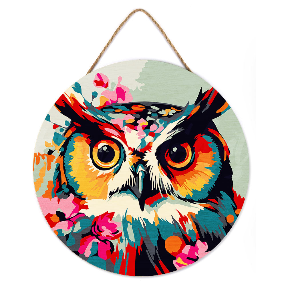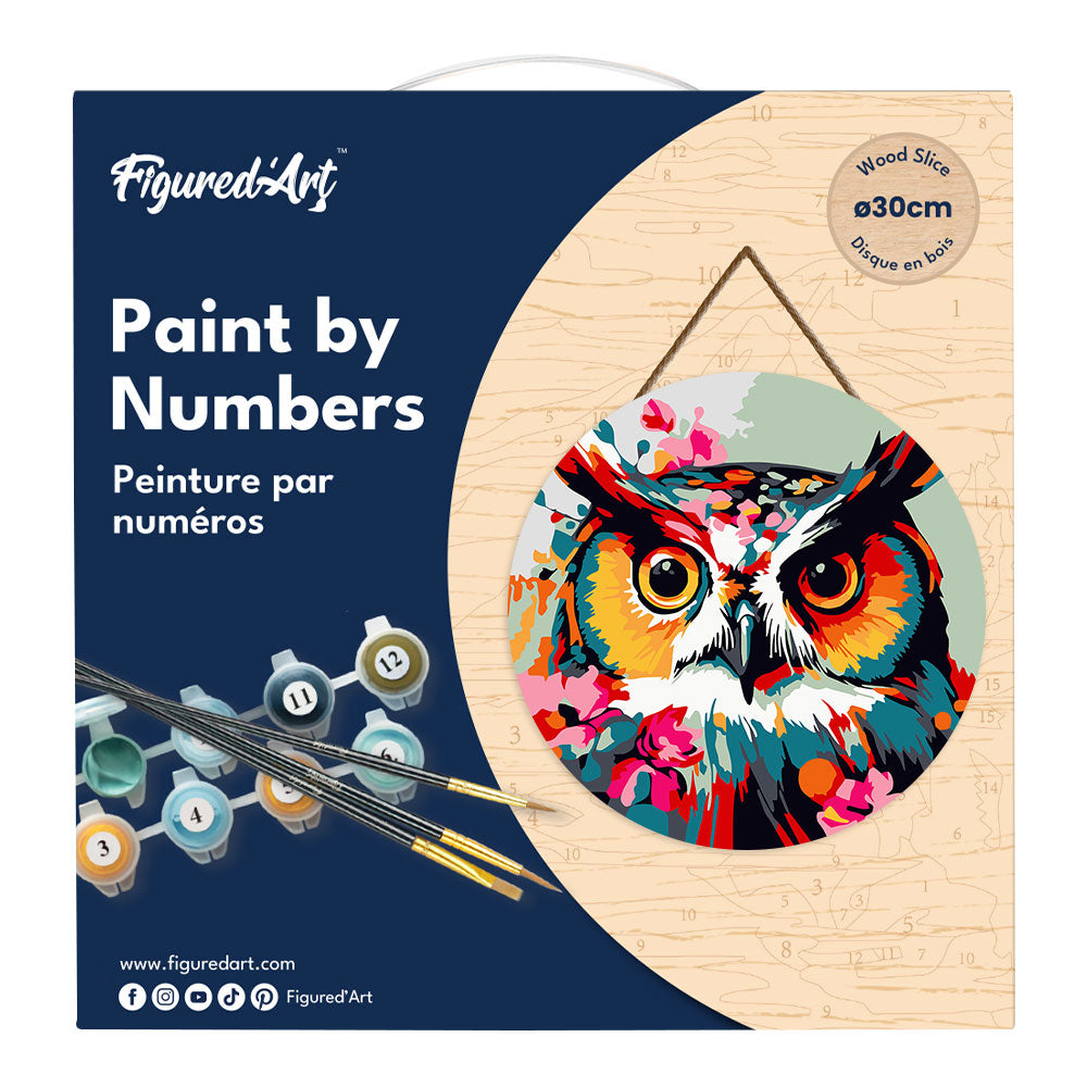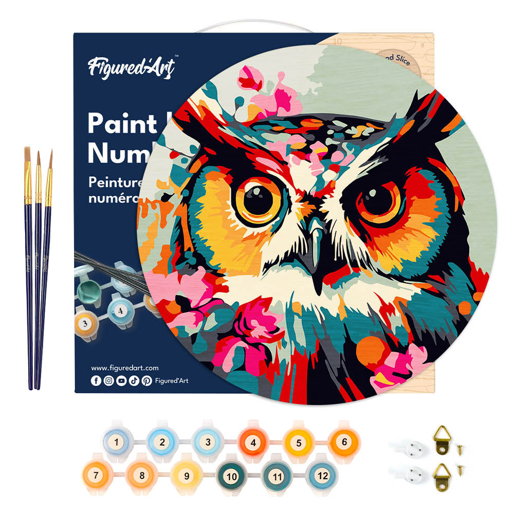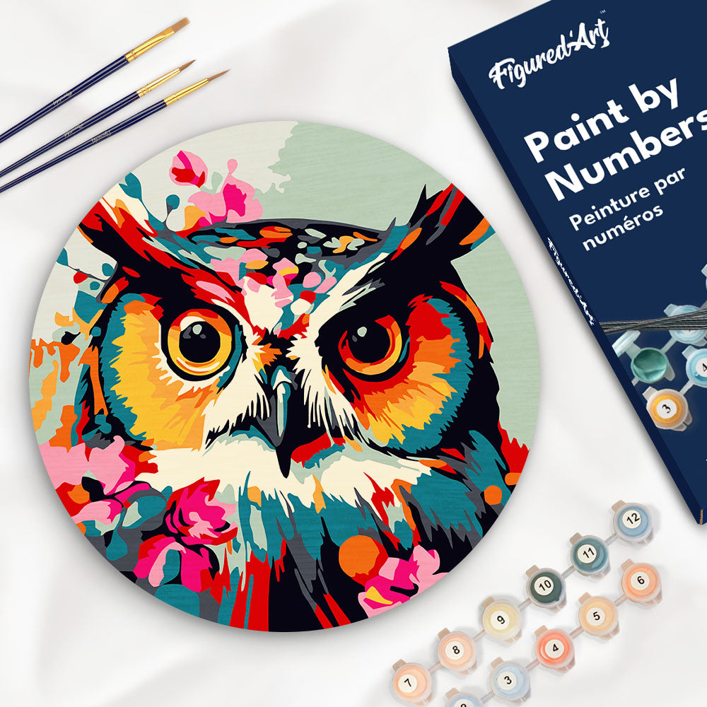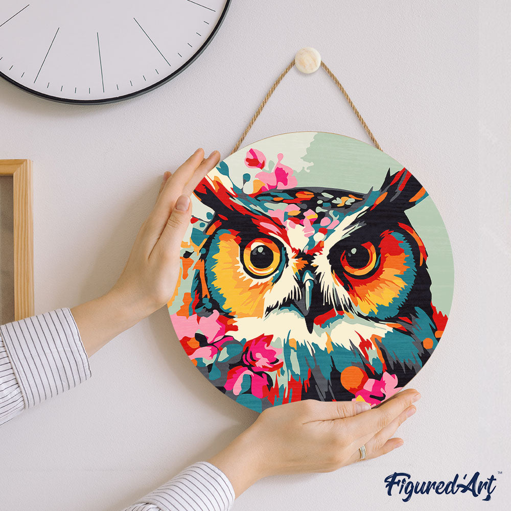 Jetzt kreativ werden und Ihr Zuhause mit eigener Kunst verschönern – bestellen Sie das Malen nach Zahlen auf Holzscheibe Fantasie-Eule und Blumen von Figured'Art.