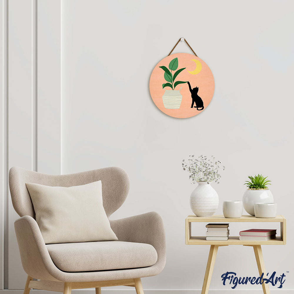 - Eine hochwertige Holzscheibe mit dem Motiv „Kätzchen und Pflanze im Mondlicht“.