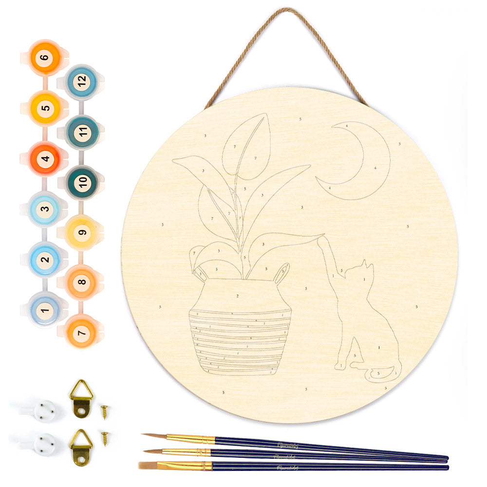 Entdecken Sie eine beruhigende Kreativpause mit dem Malen nach Zahlen auf Holzscheibe „Kätzchen und Pflanze im Mondlicht“ von Figured'Art. Dieses Set vereint entspannte Freizeitgestaltung mit dekorativem Anspruch: Eine klare, detaillierte Anleitung führt Sie Schritt für Schritt zu einem beeindruckenden Kunstwerk, das Wärme und Stil in Ihr Zuhause bringt.