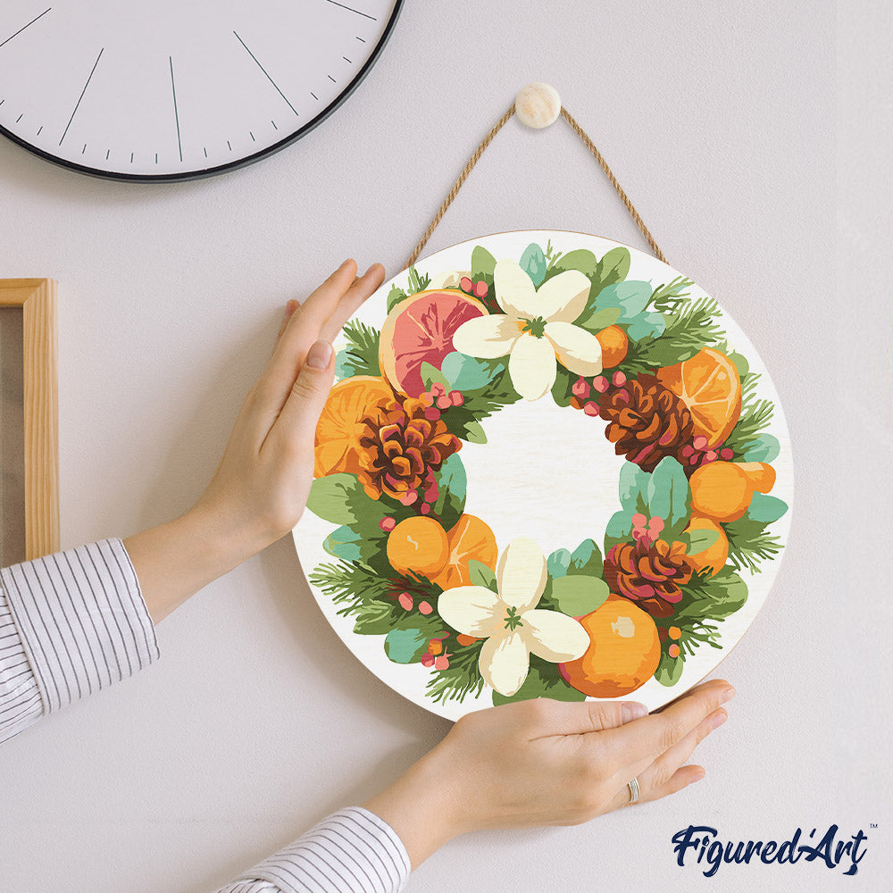 Verwandeln Sie eine schlichte Holzscheibe in eine eindrucksvolle Kranz-Deko mit diesem Malen-nach Zahlen-Set von Figured'Art. Kranz aus Zitrusfrüchten und Tanne bringt Farbe, Wärme und eine einzigartige Note in Ihr Zuhause.
