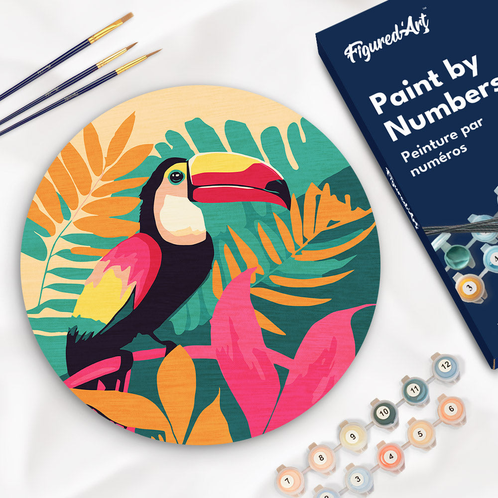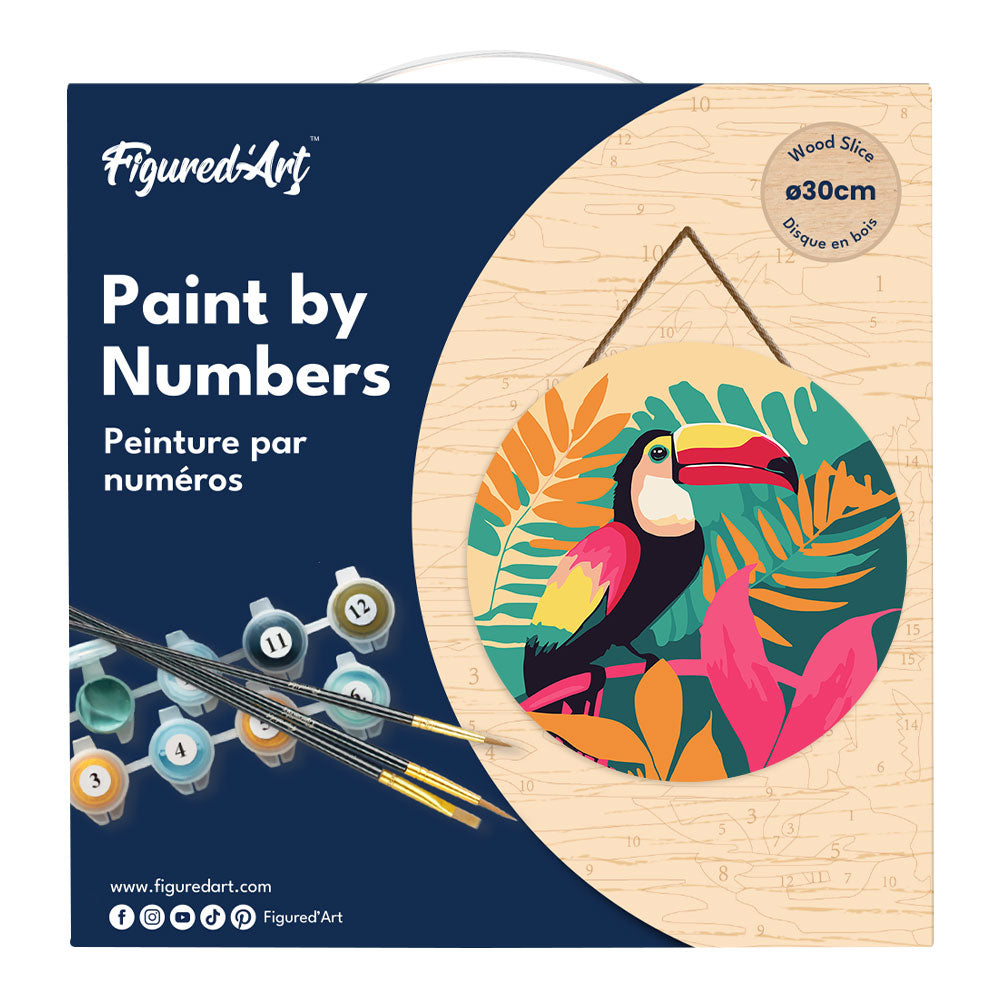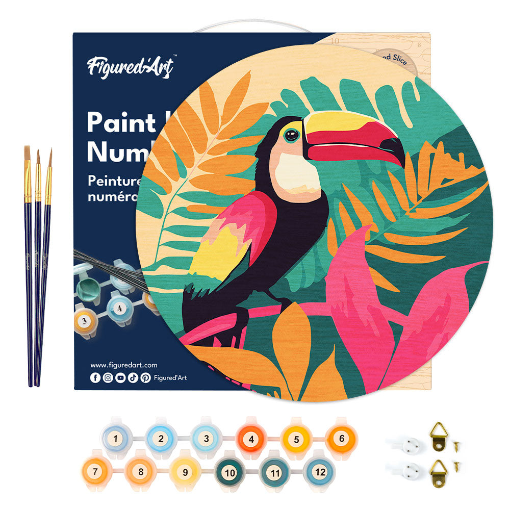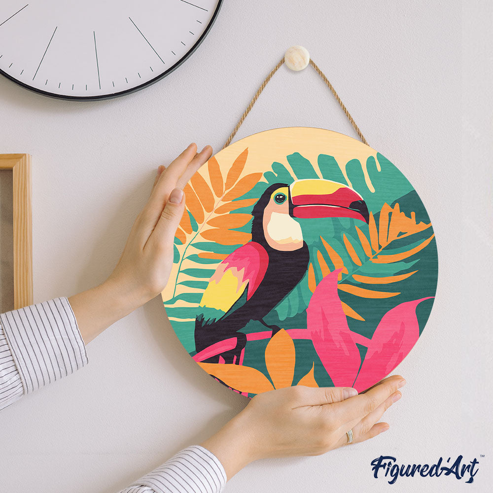 Erleben Sie Malen nach Zahlen auf Holzscheibe – Tropischer Tukan von Figured'Art: ein beruhigendes, kreatives Hobby, das Ruhe und Freude in Ihren Alltag bringt. Die klare, detaillierte Anleitung ermöglicht beeindruckende Ergebnisse schon ohne Vorerfahrung, während das Set als einzigartiges Wohnaccessoire mit persönlicher Note überzeugt.