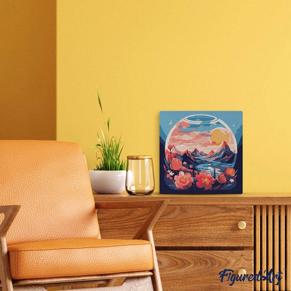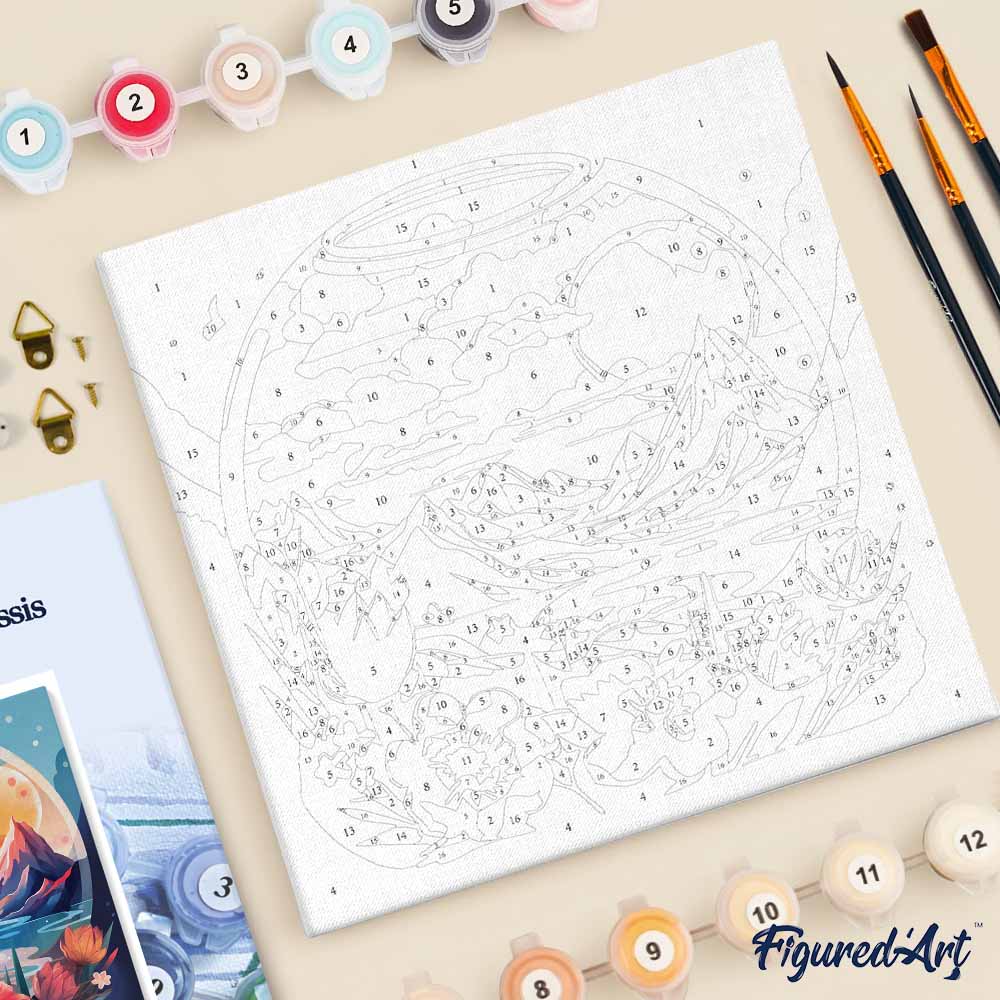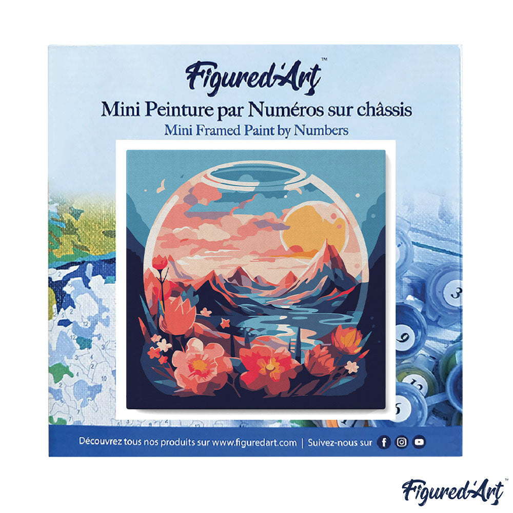 Mini Malen nach Zahlen mit Rahmen 20x20cm - Berge im Glaskugel von Figured'Art vereint kompakte Malfreude mit hochwertiger Umsetzung. Das vollständige Set bietet dir alles, was du brauchst, um direkt loszulegen und dein eigenes Bergpanorama zu erschaffen.