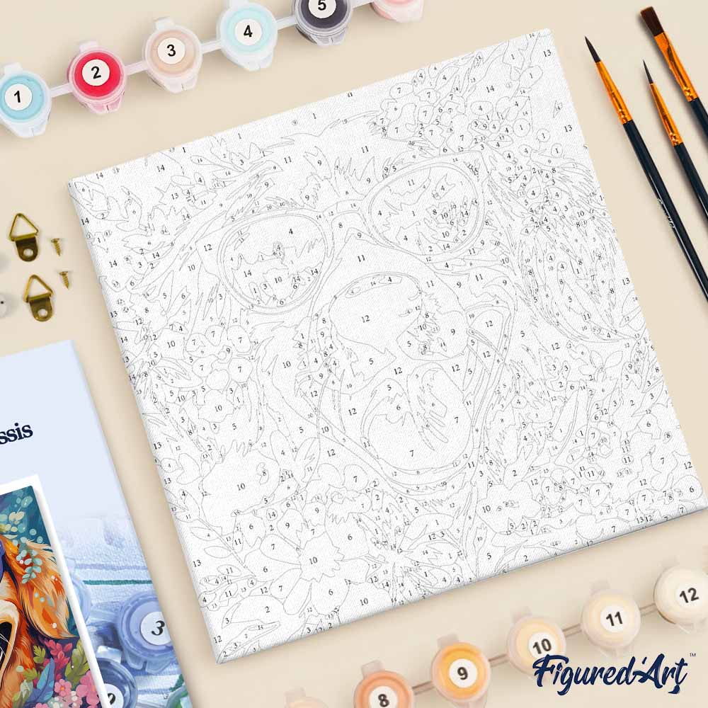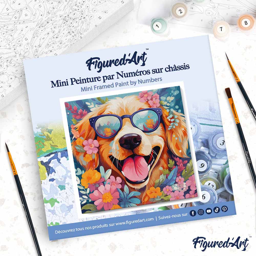 Entdecken Sie das Mini Malen nach Zahlen mit Rahmen 20x20cm – Fantasie-Hund und Blumen von Figured'Art, ein kompaktes, entspannendes Kreativprojekt. Das Set enthält alles, was Sie brauchen, um Ihr eigenes Kunstwerk zu verwirklichen: eine nummerierte Leinwand, einen bereits montierten Holzrahmen, 3 Nylon-Pinseln in verschiedenen Größen, 1 nummeriertes Farbset und einen Papierausdruck Ihres Motives zur Veranschaulichung.