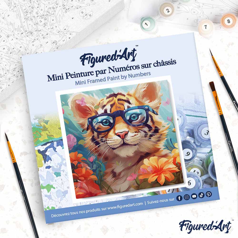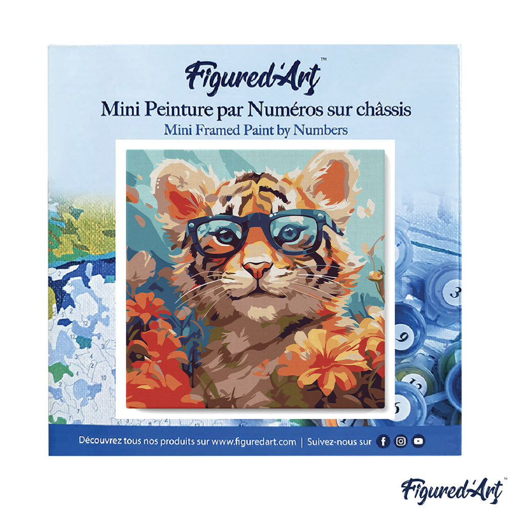 Bestellen Sie jetzt das Mini Malen nach Zahlen Set 20x20 Rahmen von Figured'Art und starten Sie sofort in Ihr kreatives Mal-Abenteuer – Fantasie-Tigerjunges und Blumen warten darauf, von Ihnen zum Leben erweckt zu werden.