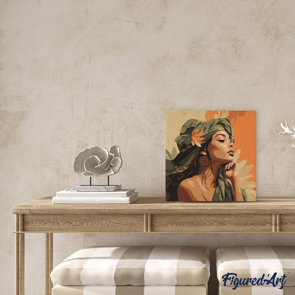 Dieses vollständige Set bietet alles, was Sie benötigen, um direkt Ihr eigenes Kunstwerk zu verwirklichen: eine hochwertige Leinenleinwand mit strukturierter Oberfläche, ein montierter Holzrahmen, 3 Nylon-Pinsel in verschiedenen Größen, ein Farbset mit 10–14 Töpfen Acrylfarben, sowie Motiv-Papier als Vorlage. Die Szene zeigt Frau im Afrikanischen Turban und dient als inspirierendes Motiv für Ihr persönliches Bild.