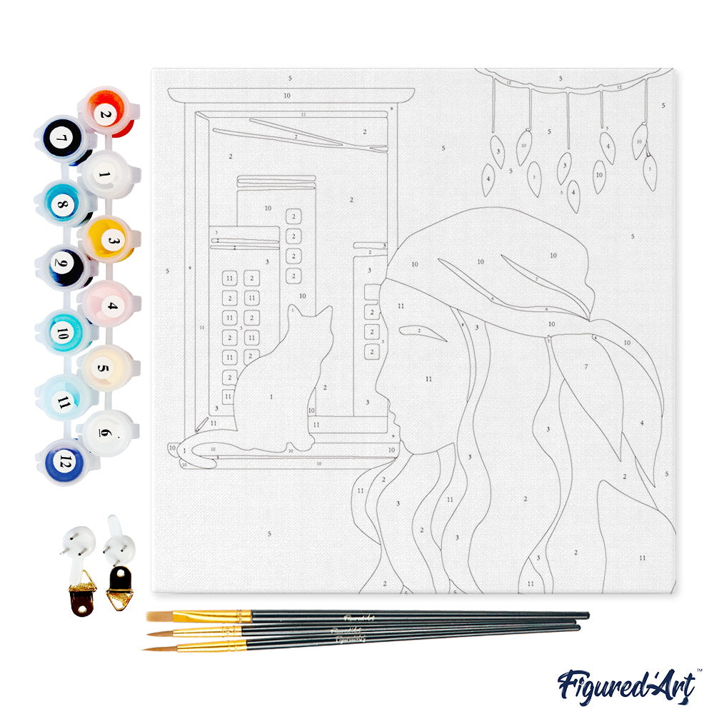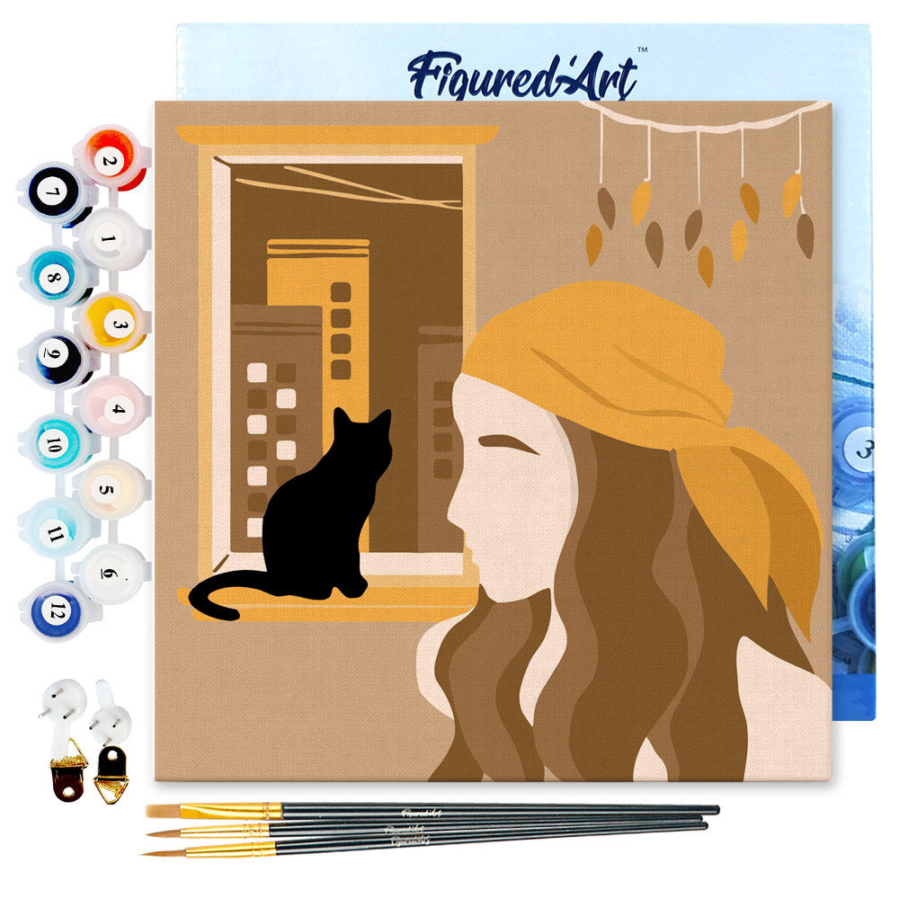 Bestellen Sie jetzt Ihr Figured'Art Mini-Malen-nach-Zahlen-Kit – Ihr kreatives Meisterwerk „Frau und ihre Katze am Fenster“ wartet darauf, von Ihnen gestaltet zu werden.