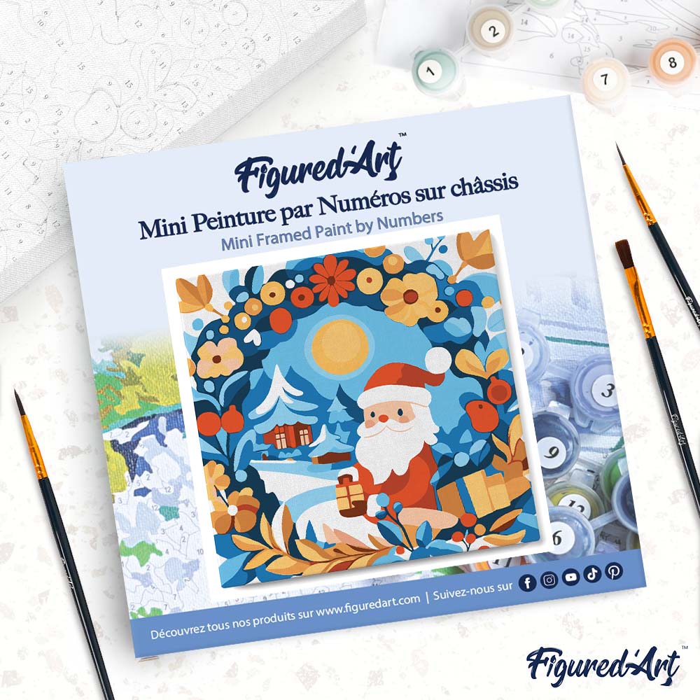 Tauchen Sie ein in die festliche Welt des Mini Malen nach Zahlen mit dem 20x20 cm Rahmen-Set von Figured'Art: Kranz und Weihnachtsmann. Dieses charmante Kreativprojekt weckt sofort Freude am Malen und verwandelt Ihre wenigen Pinselstriche in ein fertiges Kunstwerk zum Dekorieren.