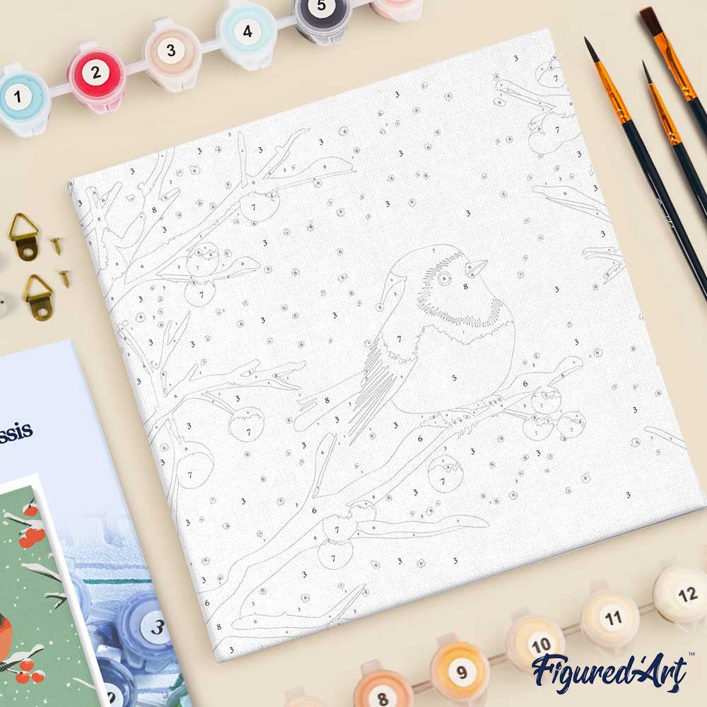 Mit dem Malen-nach-Zahlen Mini-Set Rotkehlchen im Winter von Figured'Art erleben Sie Präzision, Spaß und sofortiges Malerlebnis – kompakt in einem stilvollen 20x20 cm Format.