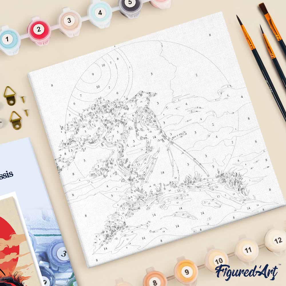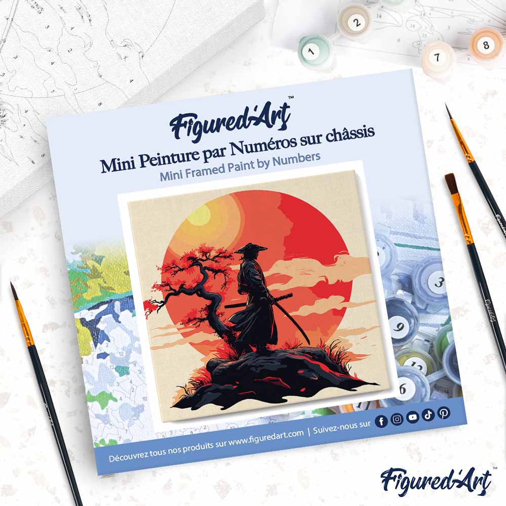 Erleben Sie Ruhe und Zen beim Malen nach Zahlen mit dem Mini-Set von Figured'Art: Samurai bei Sonnenuntergang direkt bei Ihnen zu Hause. Die vorgespannte 20x20 cm Leinwand im stabilen Holzrahmen wartet darauf, mit dem nummerierten Farbset zu einem eindrucksvollen Kunstwerk zu werden. Das kompakte All-in-One-Set ist perfekt für entspanntes Malen und kreative Momente zwischendurch.