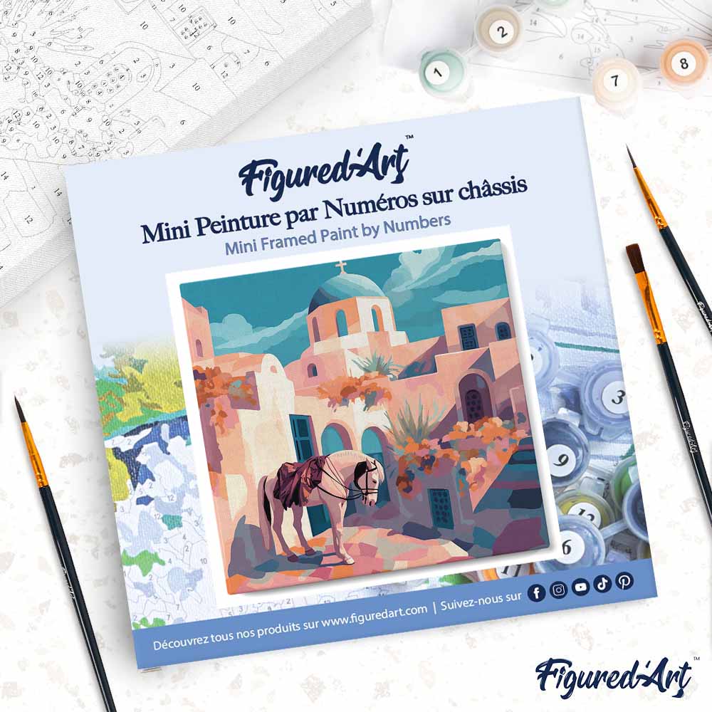 Entdecken Sie das Mini Malen nach Zahlen mit Rahmen 20x20cm – Santorini Pferdeszene von Figured'Art, eine charmante, kompakte Kunst, die Sie bequem von zuhause aus zu einem meisterhaften Resultat führt. Die handliche 20x20 cm Leinwand passt perfekt in jede Deko-Ecke und verwandelt sich mit nur wenigen Farbstrokes in eine detailreiche Szenerie am Tilt des Santorini-Abends.