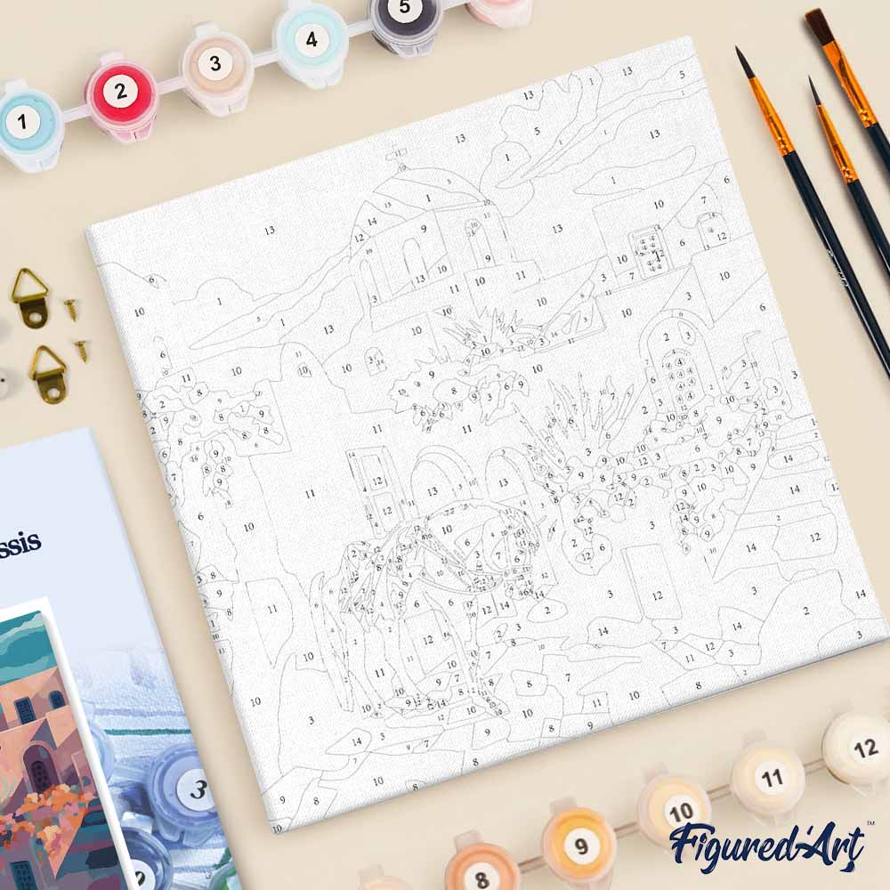 Starten Sie sofort Ihr kreatives Projekt – bestellen Sie jetzt bei Figured'Art und genießen Sie eine entspannte Malerfahrung mit diesem charmanten Santorini-Motiv.