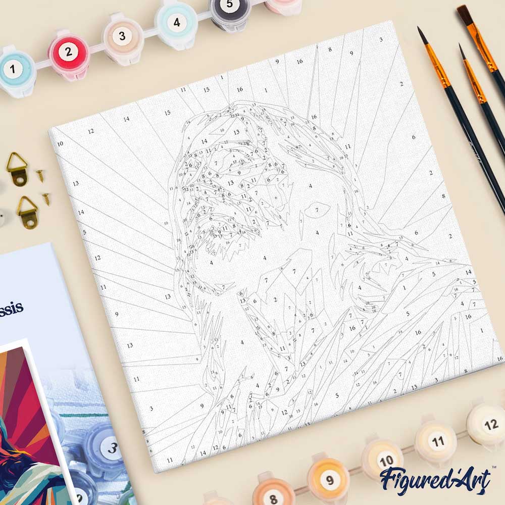 Bestelle jetzt dein Mini Malen nach Zahlen Set mit Rahmen von Figured'Art und beginne sofort mit deinem eigenen strahlenden Jesus-Kunstwerk.
