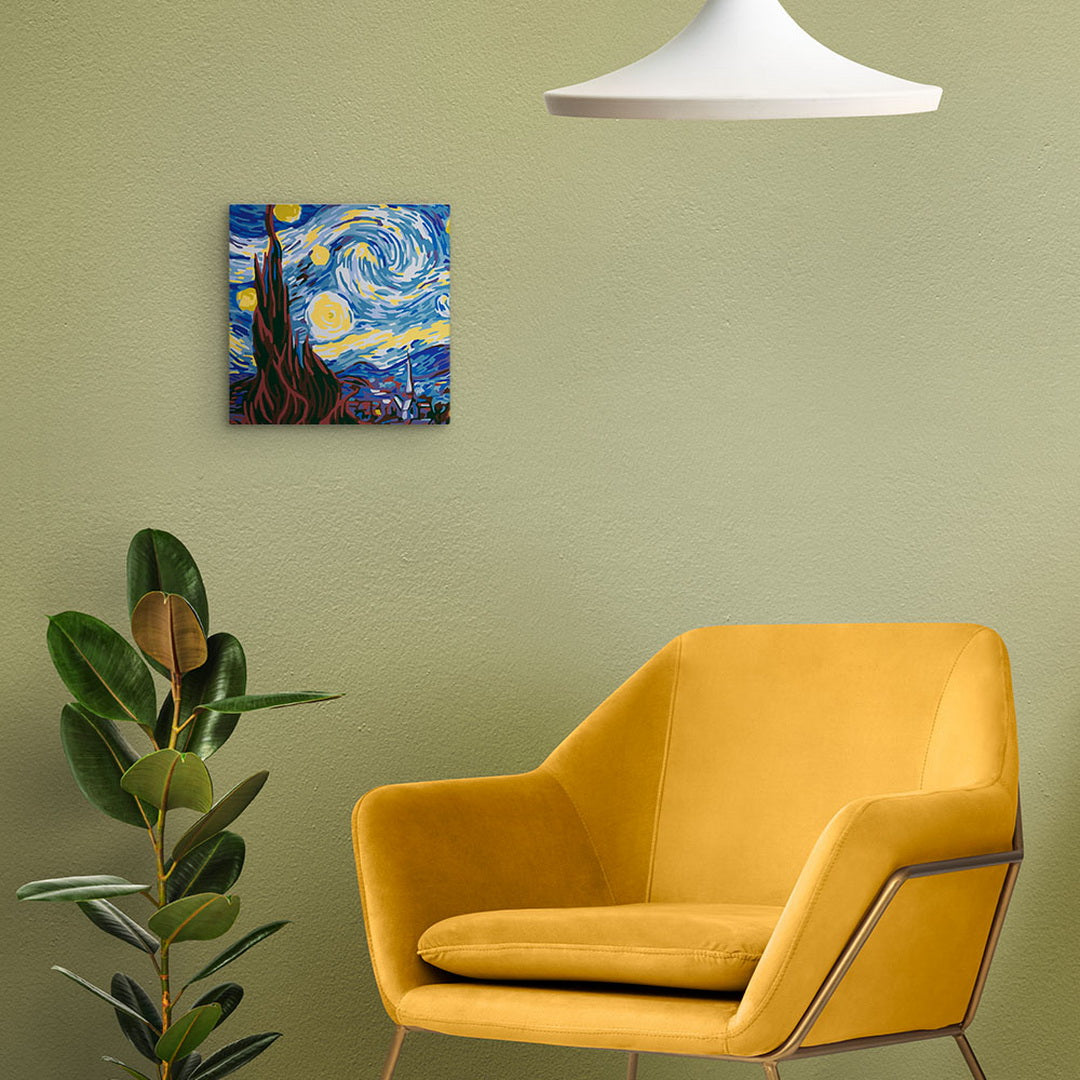 Dieses vollständige Malen-nach-Zahlen-Set bietet alles, was Sie brauchen: eine kompakte Leinwand mit montiertem Rahmen, eine abgestimmte Farbpalette und praktische Utensilien – perfekt für entspannte Pausen, als dekoratives Highlight oder als originelles Geschenk. Startklar in Minuten – legen Sie los und erleben Sie Ihr eigenes Kunstwerk im Stil von Van Gogh.